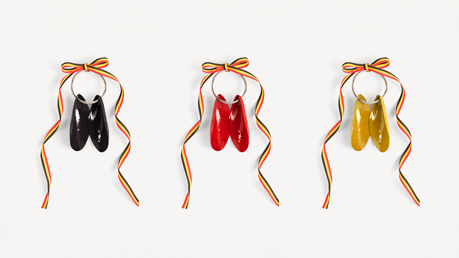 Long signature grigri stud earrings clasping a garnet in 18 ct. gold