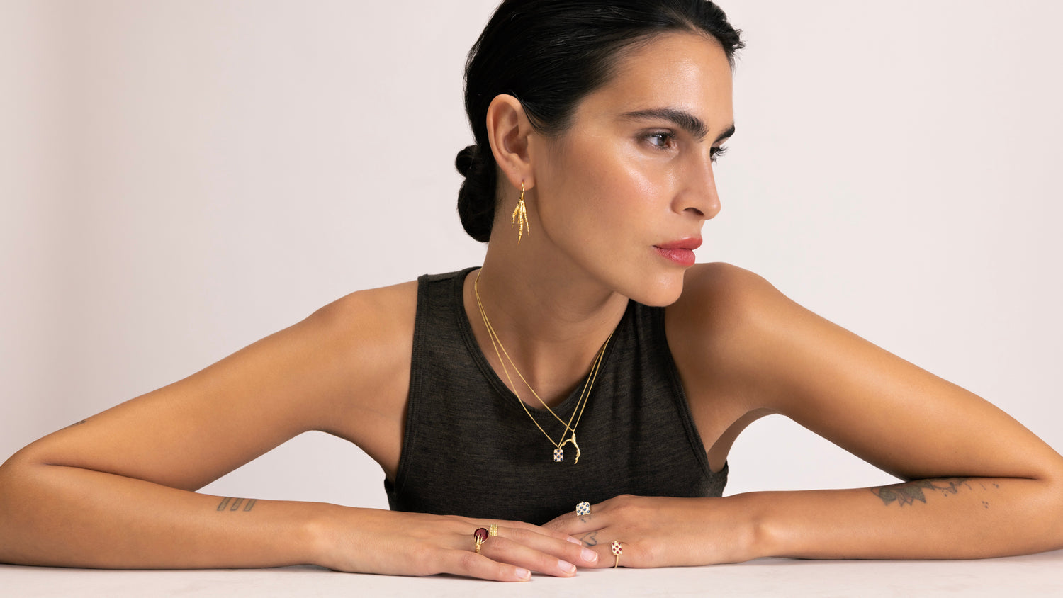 Signature grigri ring clasping a garnet in 18 ct. gold