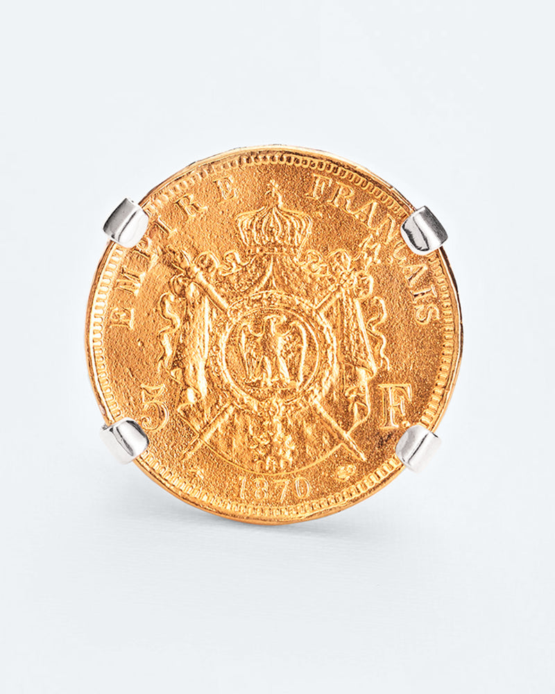 The coin is cast from an actual coin collected by Karen & katrin during one of their many flea market visits. Forever defying the traditional rules of jewellery making, we made the setting visible and thereby part of the jewel. Subtle rebels with a love for surrealism, we are drawn to unexpected combinations of materials and techniques, gently adorning your body with tales in silver and gold.