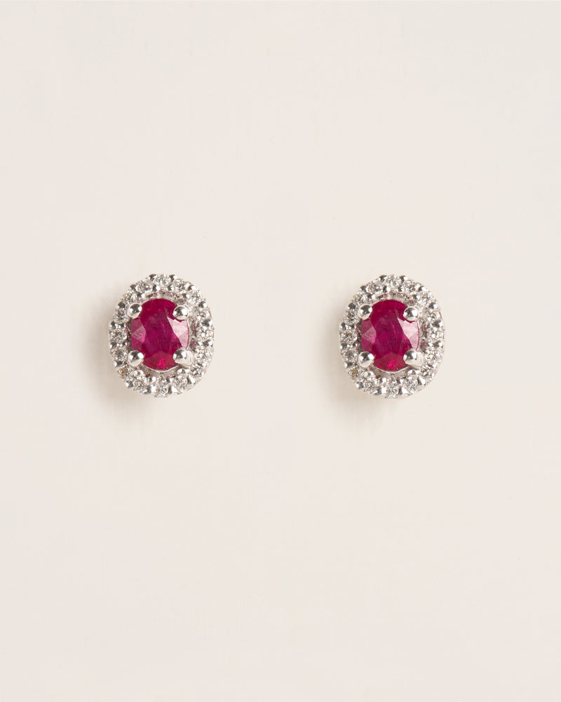 Stud earrings with oval ruby and diamond rosas in 18 ct. gold