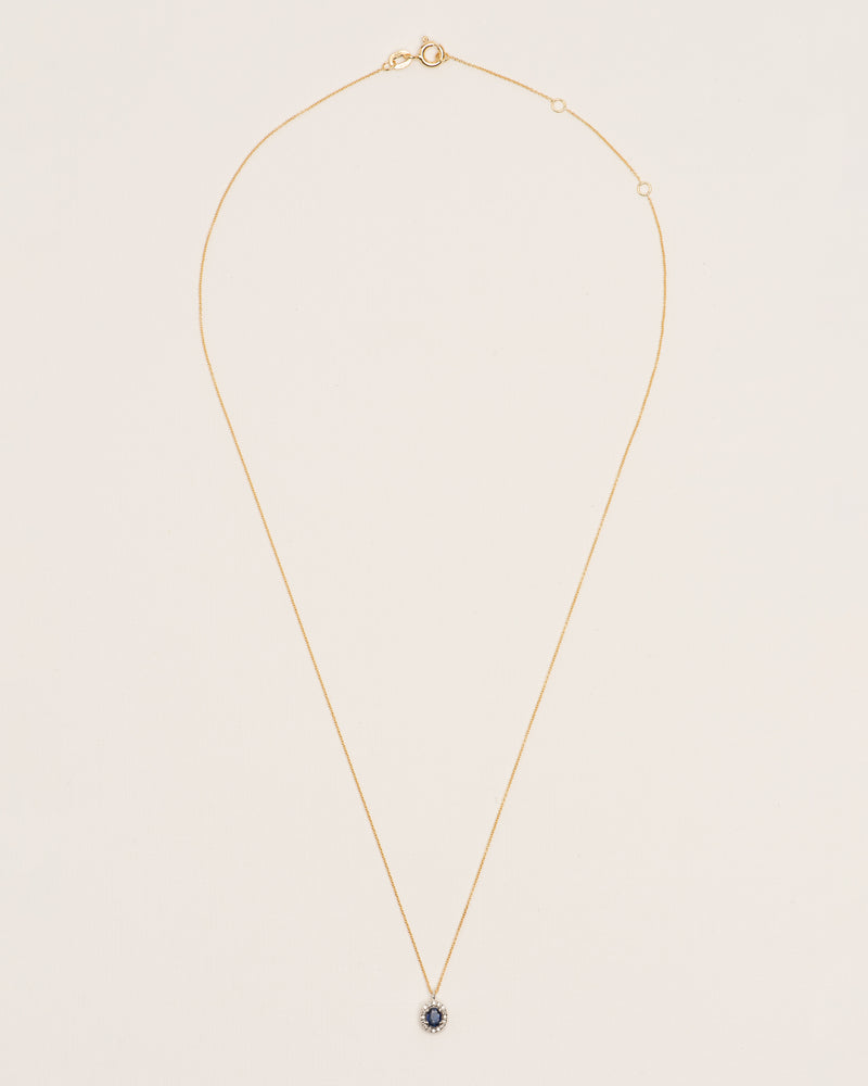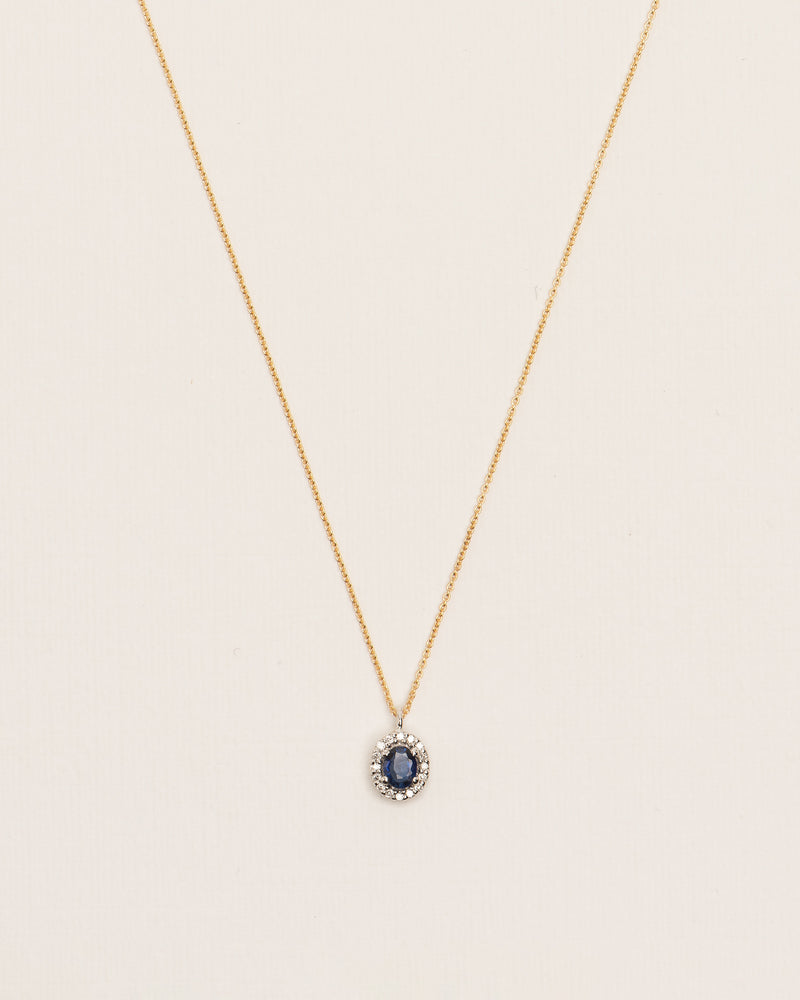 Necklace with oval sapphire and diamond halo in 18 ct. gold