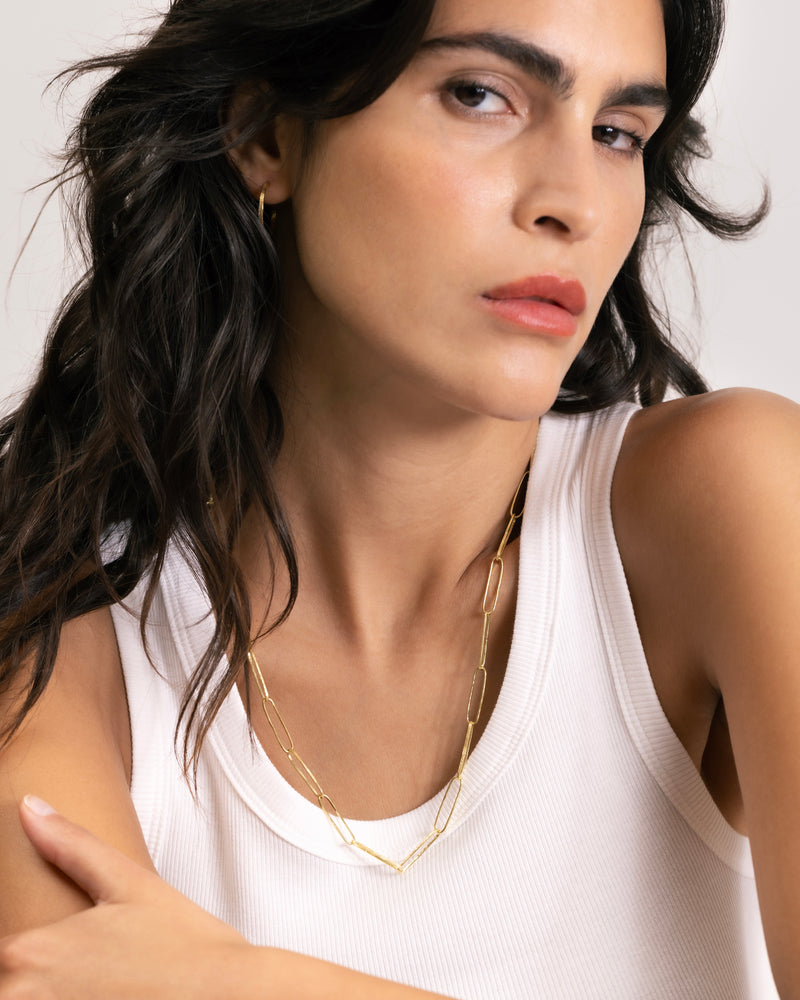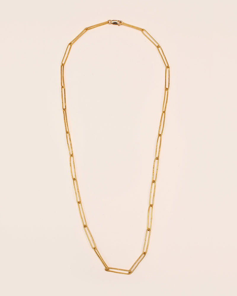 A flat link chain necklace exposing the raw beauty of unpolished gold. Carefully hammered by hand in our Antwerp atelier. This traditional technique is loud, but the result is subtle in its simplicity. Crafted from Mother Nature’s most cherished gifts, ‘Les Eternelles' are treasures to have and to hold forever.
