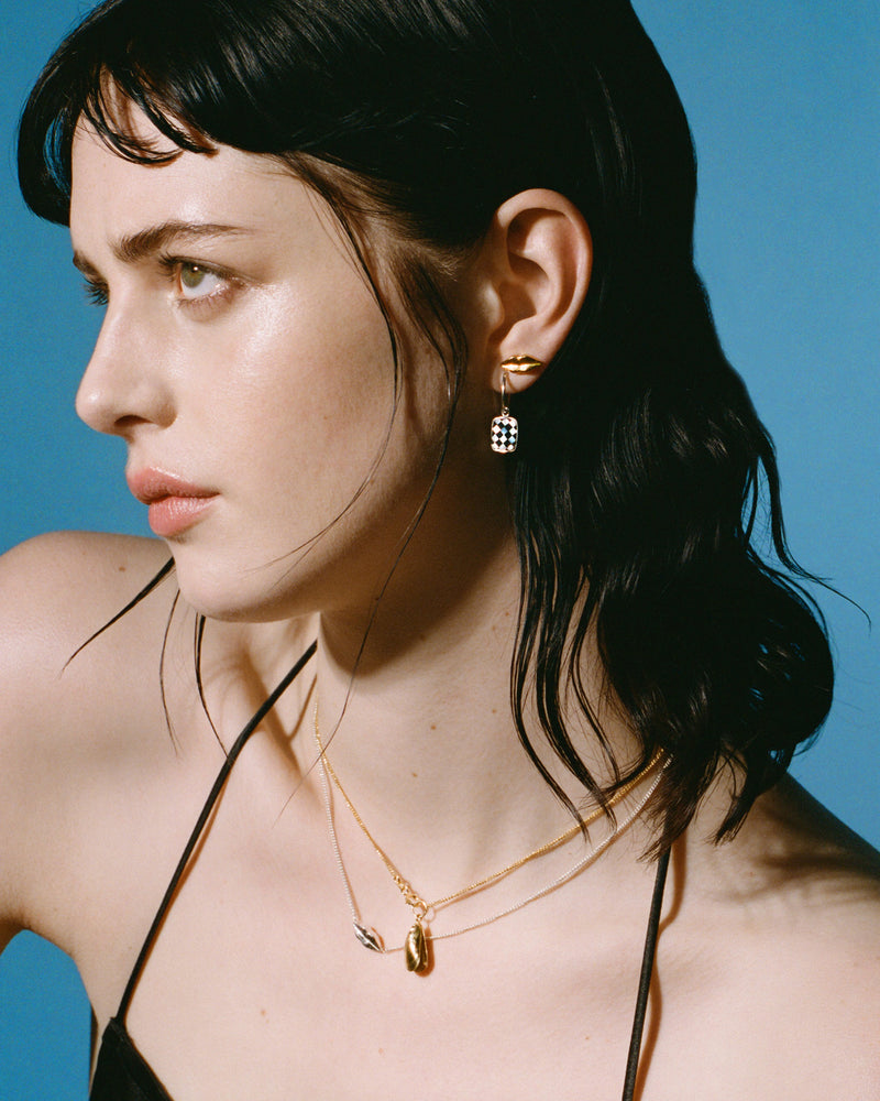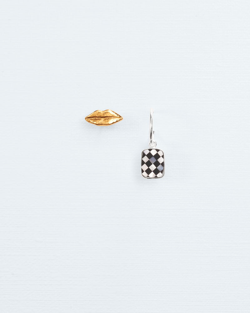 The unusual pairing of silver and gold plated with a chess inlay work of onyx with mother of pearl. The signature Wouters & Hendrix lips, referencing Dali's surrealist Mae West Lips Sofa, is a symbol that has lived through many years of Wouters & Hendrix collections. Subtle rebels with a love for surrealism, we are drawn to unexpected combinations of materials and techniques, gently adorning your body with tales in silver and gold.
