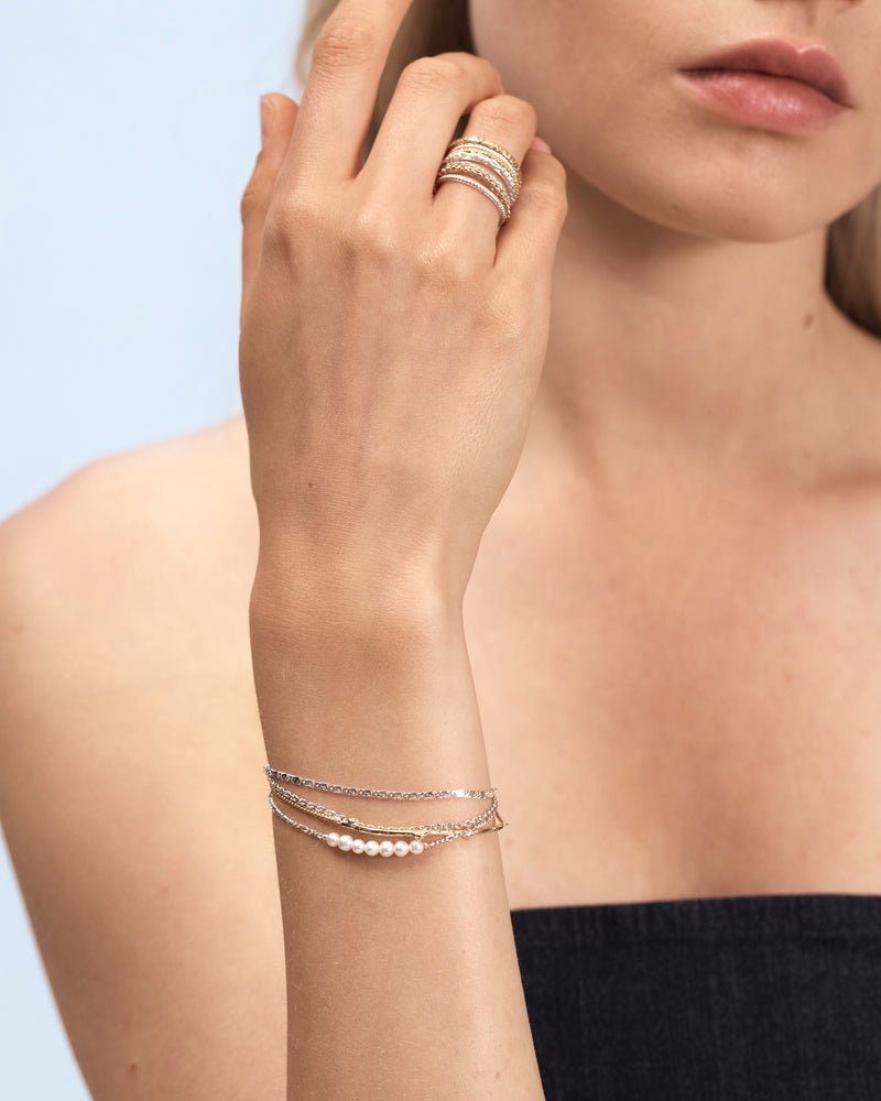 Layered necklace with branch element, chains and pearls string in silver