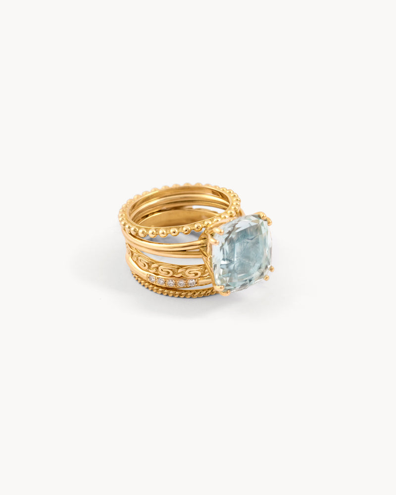 Aquamarine cocktail ring + set of three chapter rings + organic ring with white diamonds in 18 ct. gold