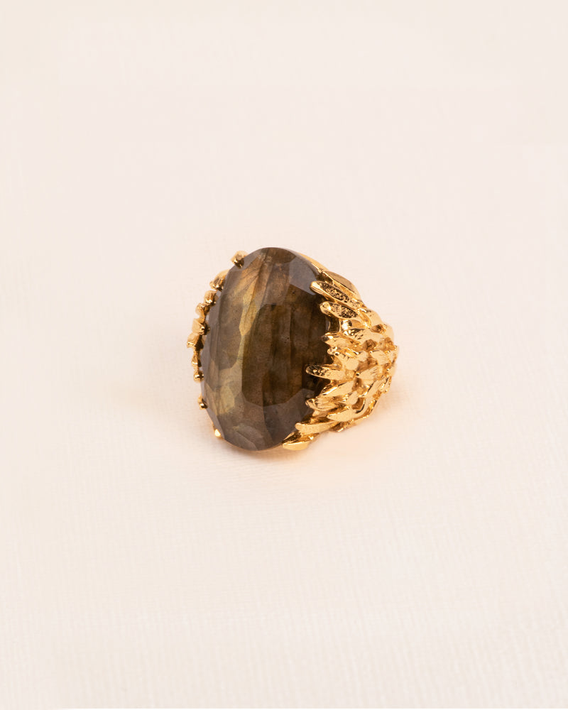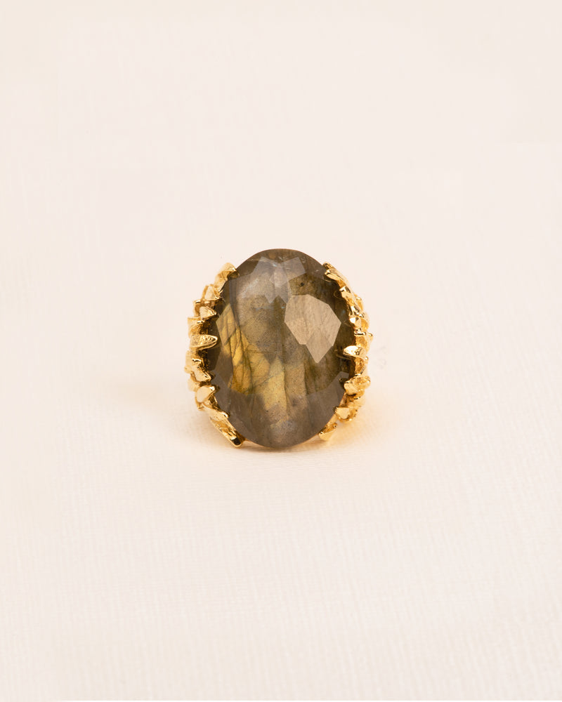 Labradorite, in all its colourful shades, clasped by a silver deck of feathers. Every ring is unique as the labradorite varies in colour. This ring from the 'Voyages Naturalistes' collection is handmade in our Antwerp atelier.