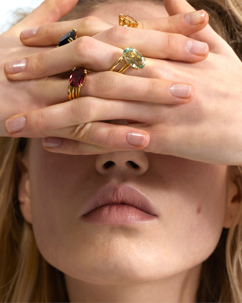 Each Wouters & Hendrix cocktail ring is meticulously crafted to order from 18-carat gold in our Antwerp atelier, tailored precisely to your ring size and crowned with one of just four distinct gemstones. Stack them high or pair them sparingly; each ring a chapter, each stack a story.
