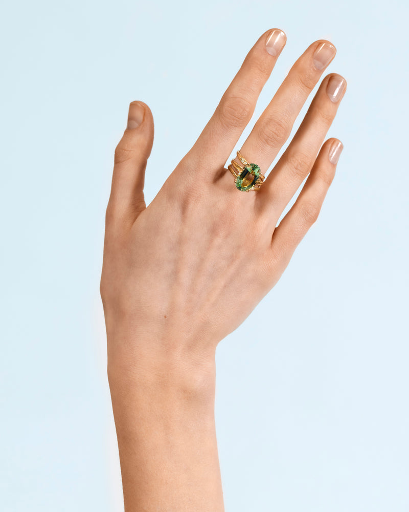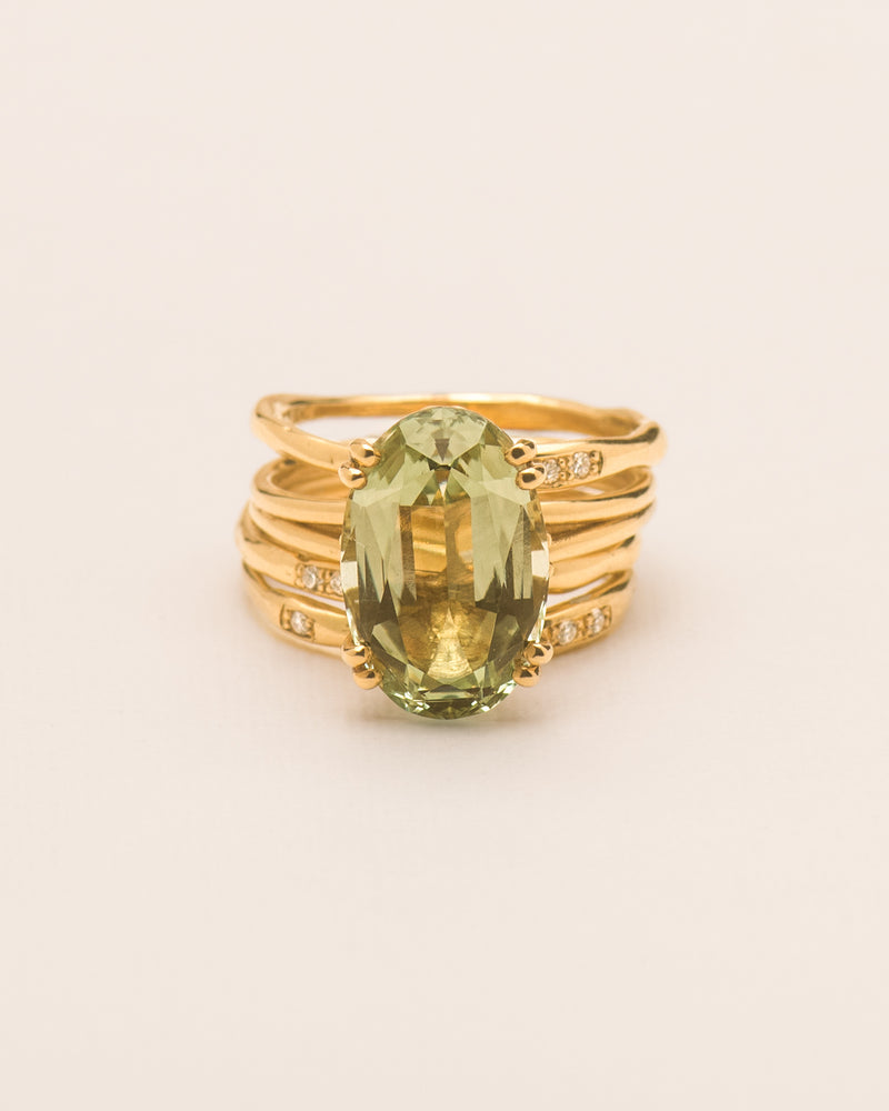 A cocktail ring is a sculptural statement. Worn not merely for the occasion, but as the occasion. Purposefully designed to let its centre stone speak for itself, this Wouters & Hendrix version is crowned with an oval-cut prasiolite, a rare green quartz found in a single Brazilian mine. Often called green amethyst, it carries the luminous calm of new beginnings and quiet transformation.