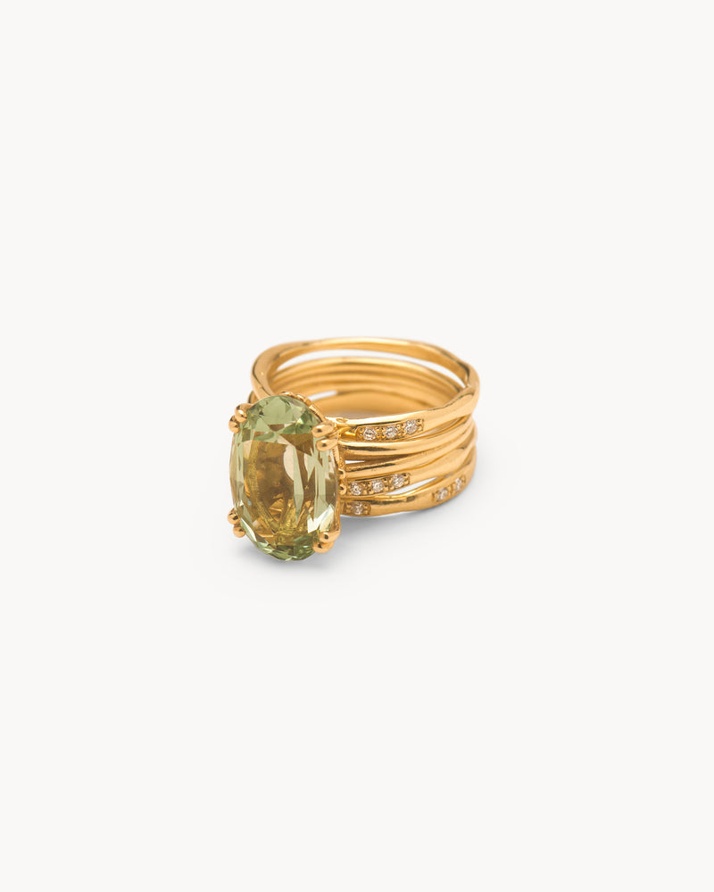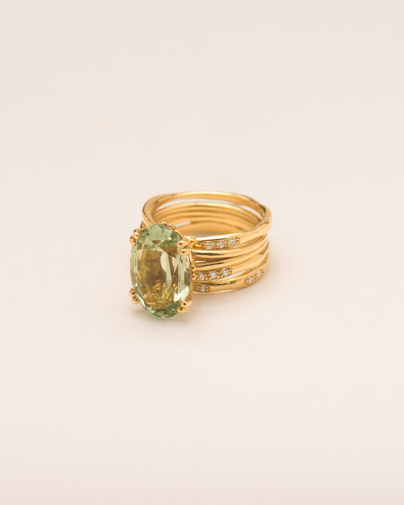 Prasiolite cocktail ring + set of three stacked organic rings with white diamonds in 18 ct. gold