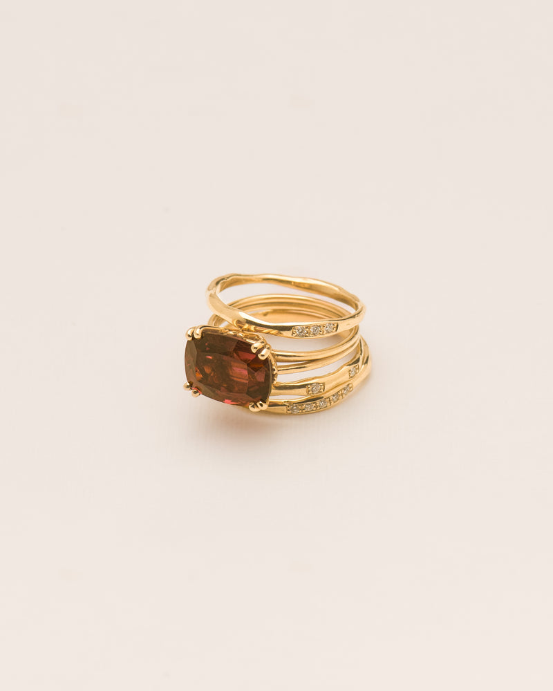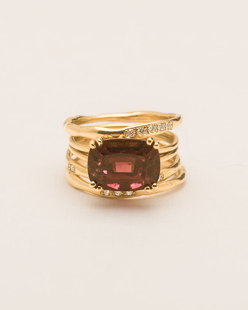 Pink tourmaline cocktail ring + set of three stacked organic rings with white diamonds in 18 ct. gold