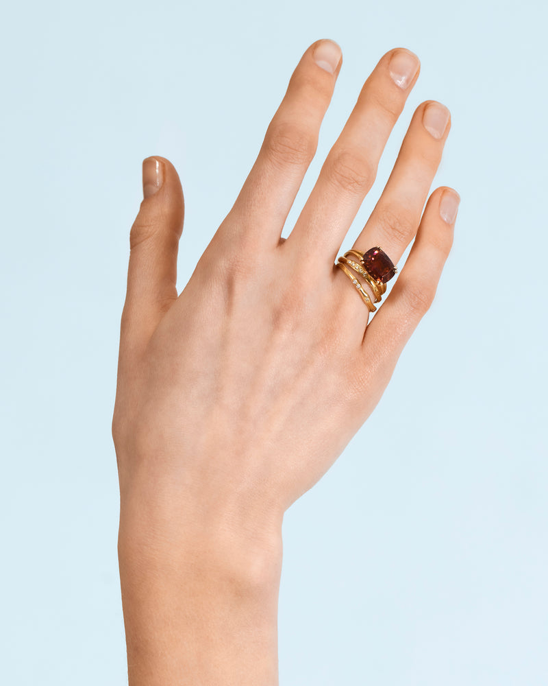 Each Wouters & Hendrix cocktail ring is meticulously crafted to order from 18-carat gold in our Antwerp atelier, tailored precisely to your ring size and crowned with one of just four distinct gemstones. Stack them high or pair them sparingly. Each ring a chapter, each stack a story.