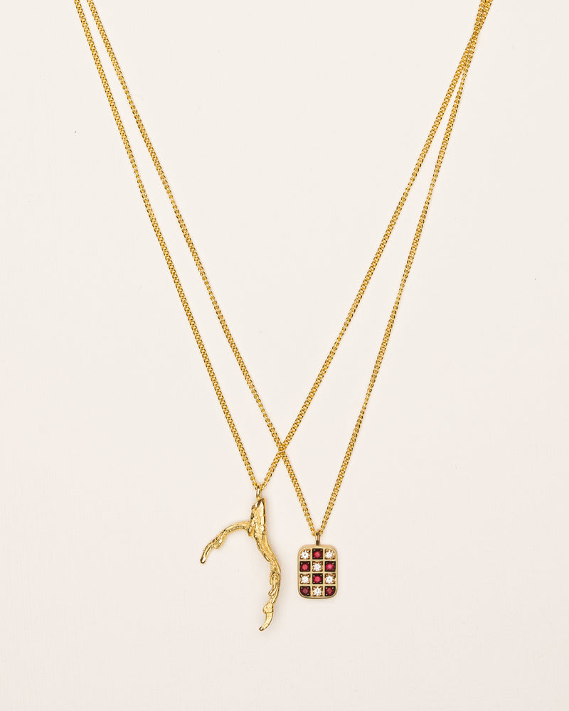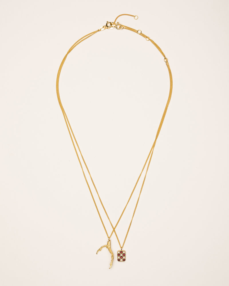 Double necklace with ruby and diamond chessboard and signature grigri pendants in 18 ct. gold