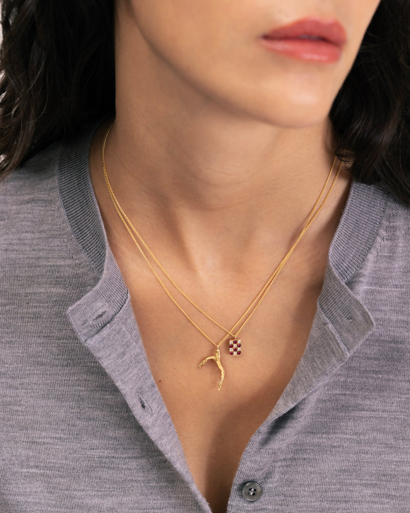 Scale is turned into an act of play with two of our most iconic creations reimagined in strikingly different proportions. Stunning on their own, the Grigri and Le Petit Philidor are magic when combined. Organic exuberance versus geometric severity: the Grigri bird’s claw meets the chessboard-inspired pendant in a dialogue of contrasts.
