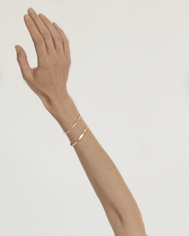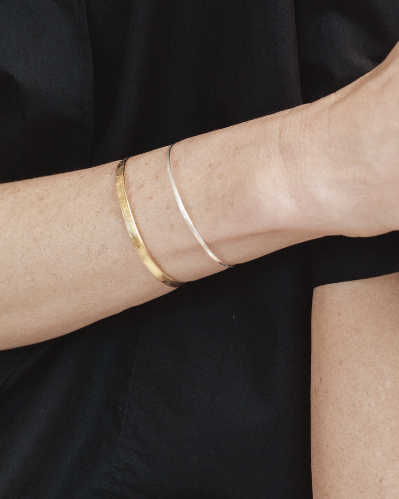 Hammered bracelet with clasp, carefully hammered by hand in our Antwerp atelier. This traditional technique is loud, but the result is subtle in its simplicity. Exposing the intrinsic beauty of the material, 'Les Eternelles' reaches back to essential forms from the beginning of time.