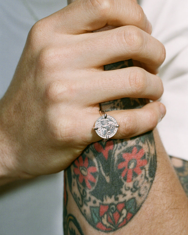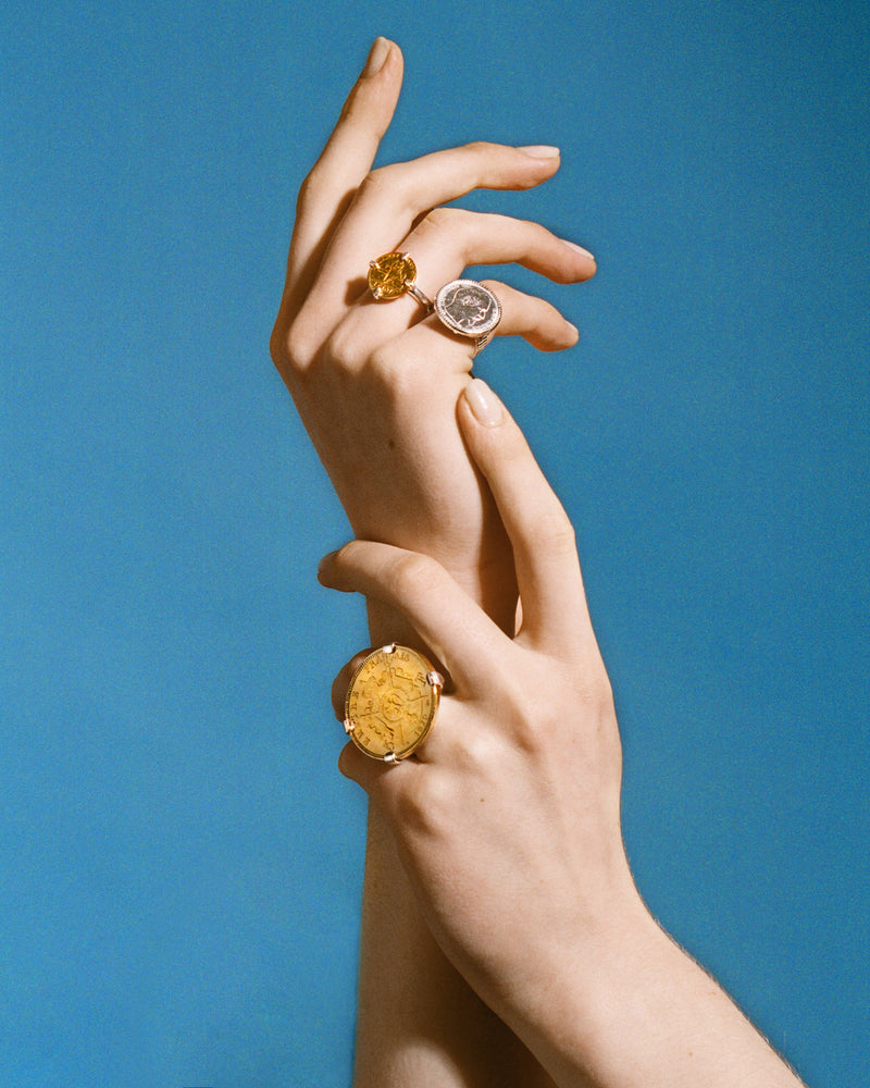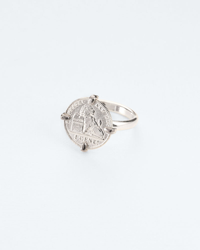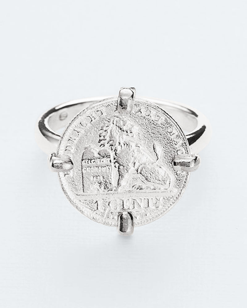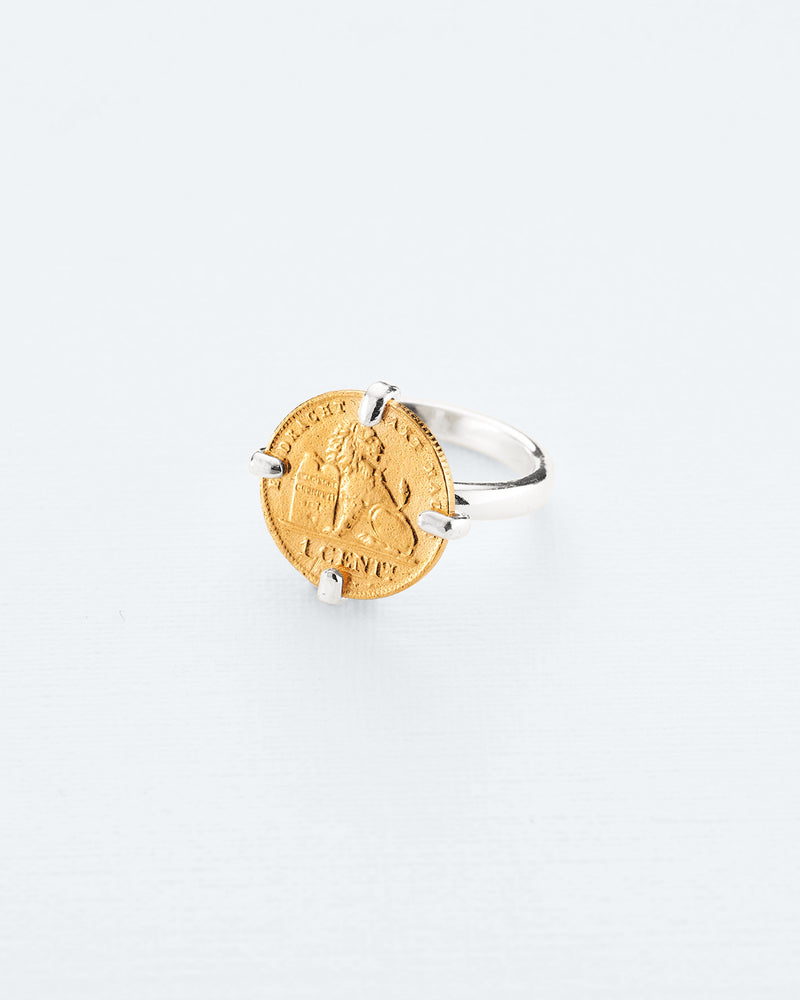 This delicate coin is being held by a visible setting, thereby defying tradition. The coin itself is cast from an acual coin collected during one of Karen and Katrin's many flea market visits. Subtle rebels with a love for surrealism, we are drawn to unexpected combinations of materials and techniques, gently adorning your body with tales in silver and gold.