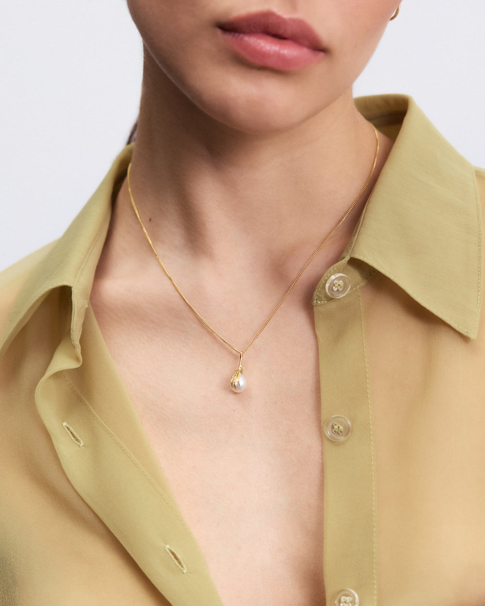 Necklace with signature grigri clasping a pearl in 18 ct. gold