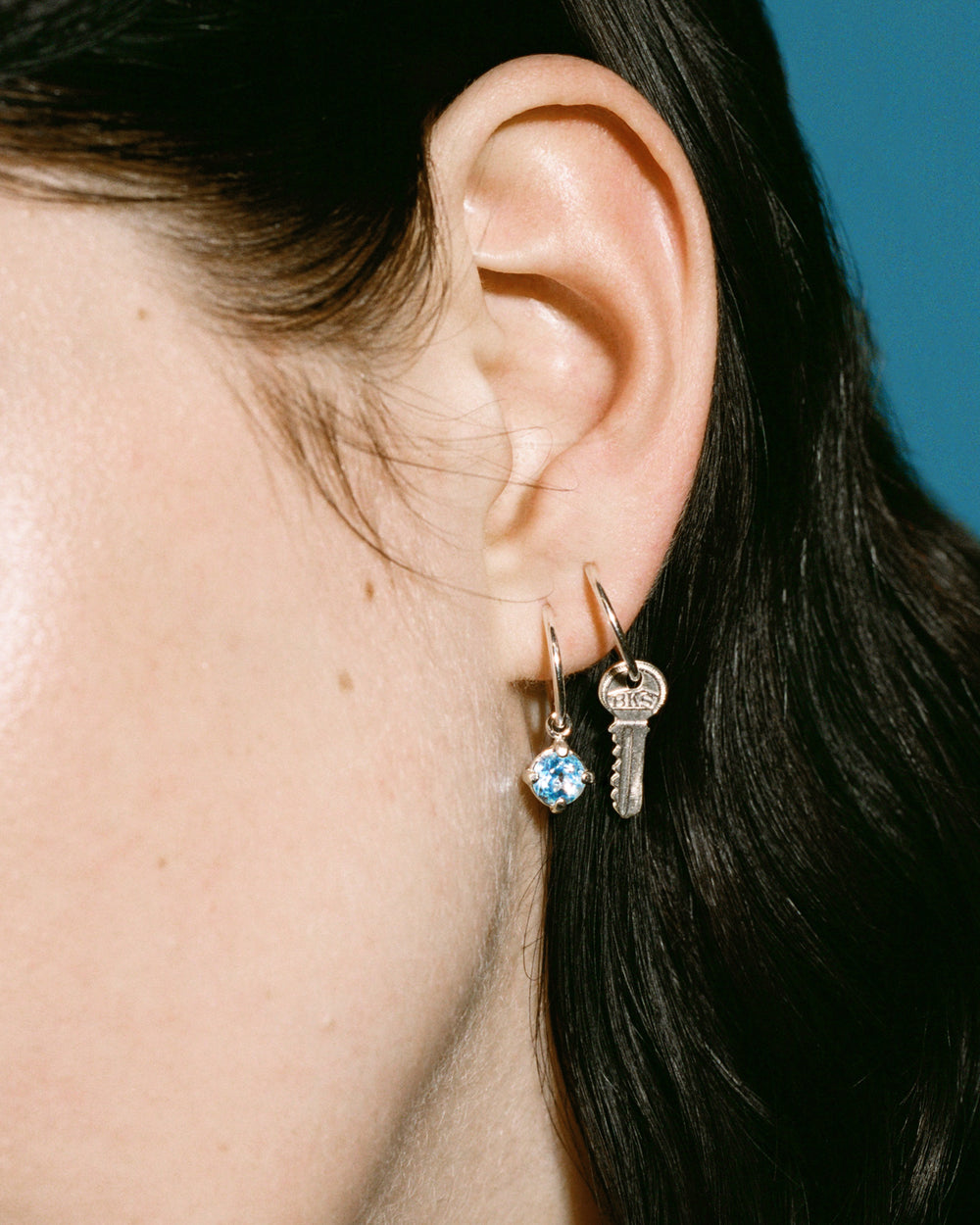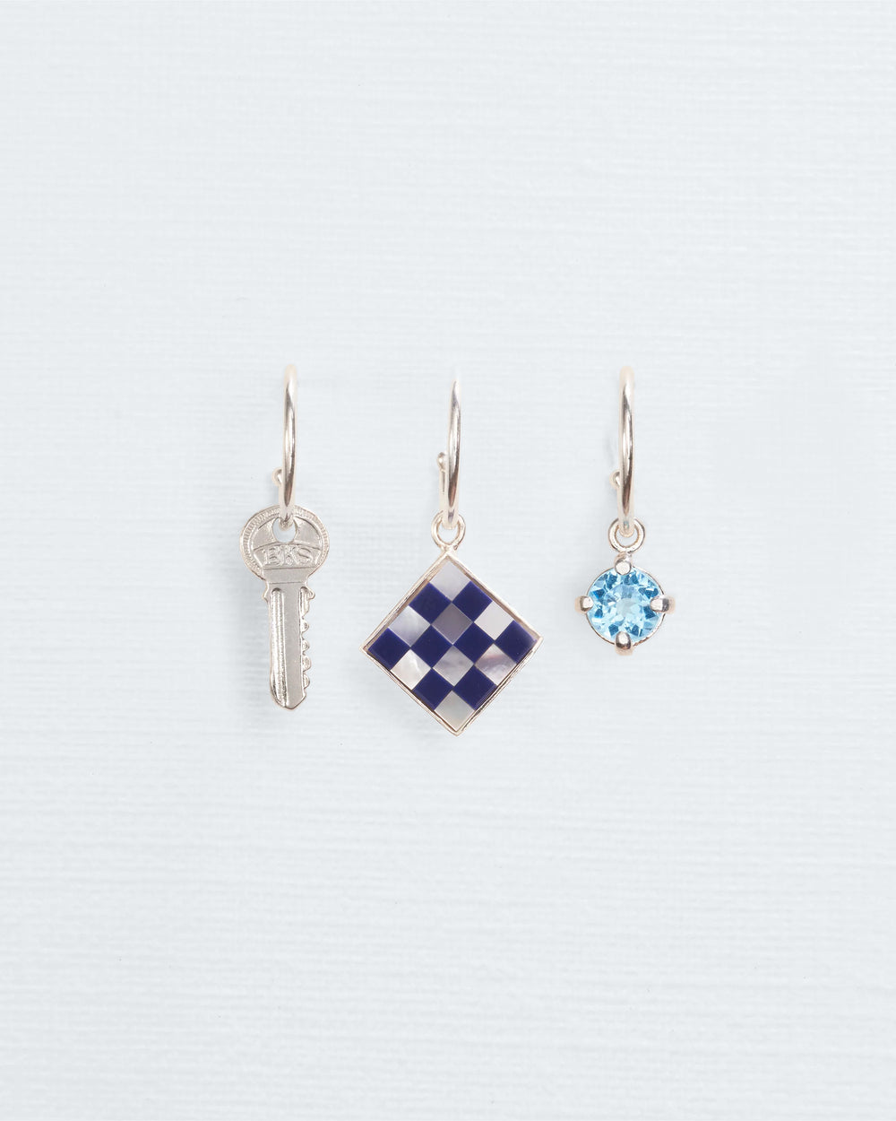 Triple charm hoops with key, mosaic and Swiss blue topaz in silver