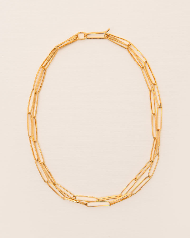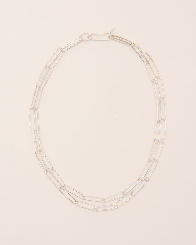 A flat link chain necklace exposing the raw beauty of shimmering silver. Carefully hammered by hand in our Antwerp atelier. This traditional technique is loud, but the result is subtle in its simplicity. Crafted from Mother Nature’s most cherished gifts, ‘Les Eternelles' are treasures to have and to hold forever.