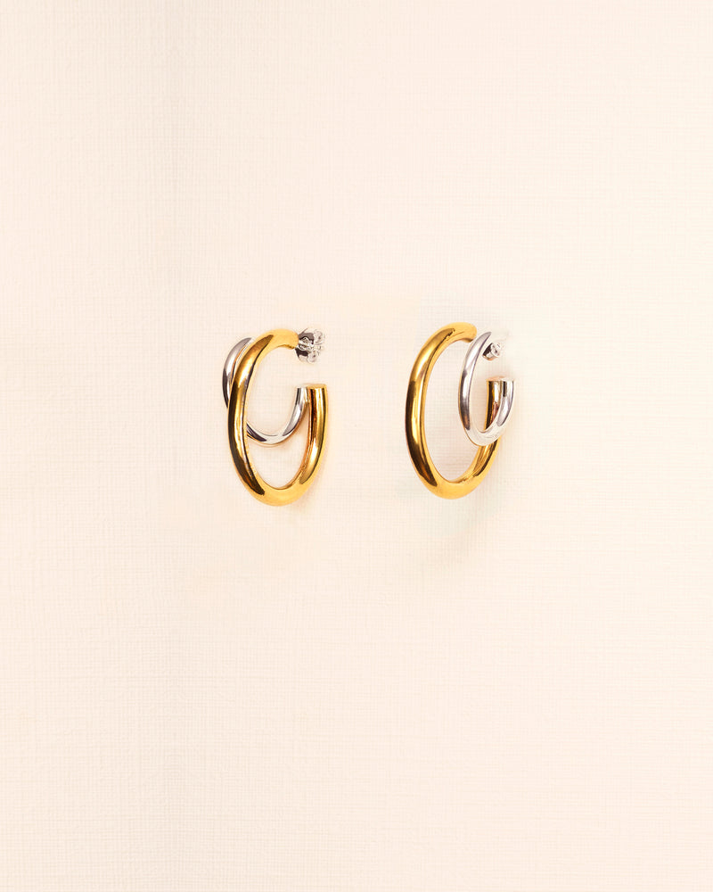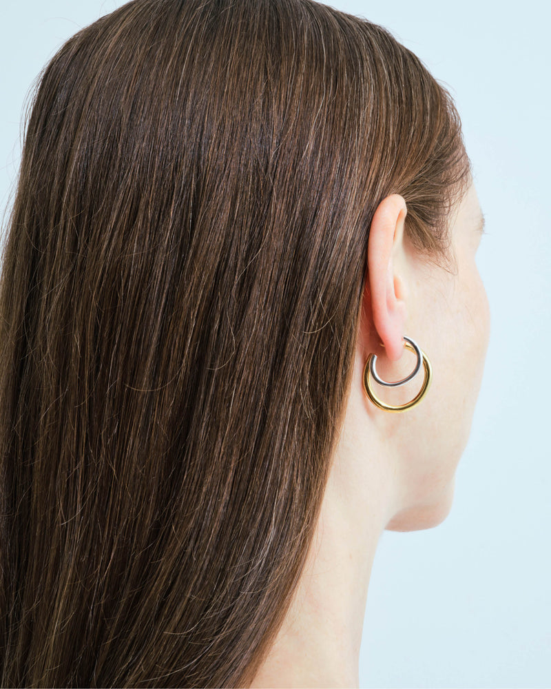 The Wouters & Hendrix designers challenged the rules of traditional jewellery making and wearing by not only combining a gold-plated and silver finish, but by adding a double hoop to each earring. Creating a trompe l'oeil effect. Subtle rebels with a love for surrealism, we are drawn to unexpected combinations of materials and techniques, gently adorning your body with tales in silver and gold.