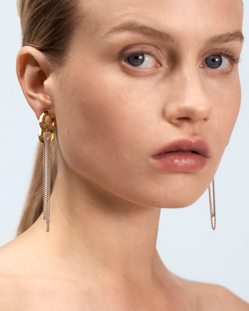 Statement clip earrings with chunky chain element and falling chains