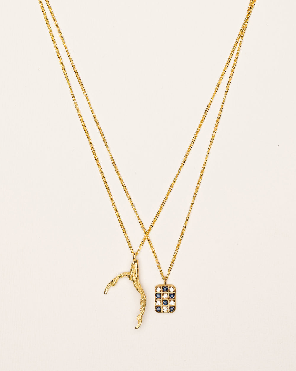 Double necklace with sapphire and diamond chessboard and signature grigri pendants in 18 ct. gold