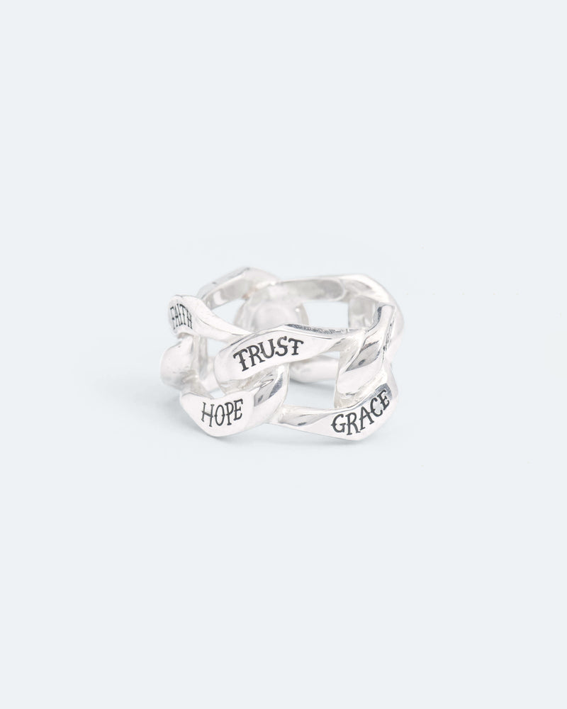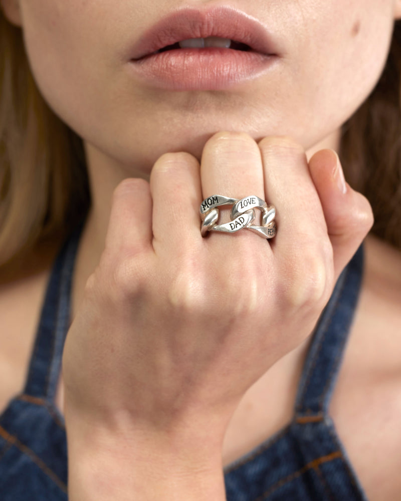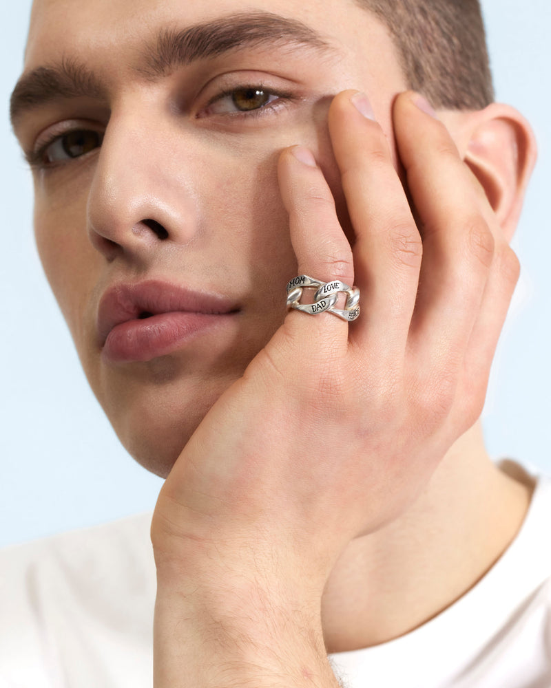 Like the old-school tattoos worn by those who sailed into the unknown, this curb chain link ring with a tattooed mantras is a declaration of devotion. A tribute to the ones we carry with us, wherever the tide may take us. Handmade by a team of goldsmiths in our Antwerp atelier, the 'No Mom, it’s not just a phase'-collection captures the essence of the sailor’s journey—the call of the wild waves, the lure of faraway harbours, the quiet pull of home. Tough as rope, yet tender at heart—each piece tells a tale of adventure, longing, and artistry, in true Wouters & Hendrix fashion.