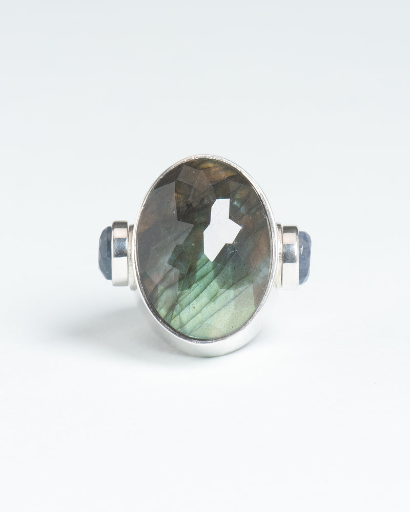 This silver version is adorned with labradorite. A gemstone known for its transformative power that enhances inner strength, shields against negativity, and sparks creativity.