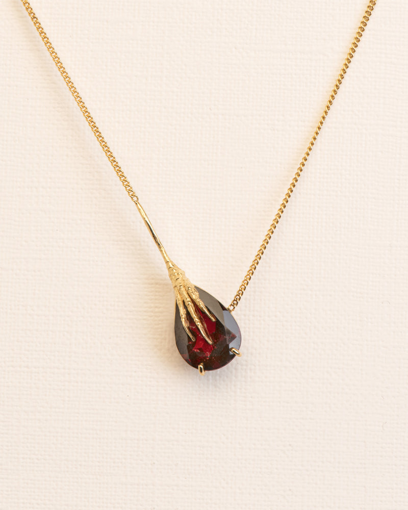 Our signature bird foot 'grigri' delicately clasping a garnet. "Is it a magpie or a crow’s foot? We are not quite sure, and it doesn’t matter, because all birds fascinate us. Their delicate feet can carefully grab a pearl.... or in a less generous mood, sneak a golden necklace off to their nest! Like magpies filling their homes with shiny treasures, we collect trinkets, stories and inspirations in our top floor design studio in Antwerp. When we first talked about making a golden bird foot, we weren’t sure where to begin. How to make a mold of a living bird’s claw? Katrin’s mother overheard us and came back with a box filled with six baby chickens, helpfully suggesting we might kill one and use its feet to be cast for a mold. Bird lovers as we are, we politely declined and went to a taxidermist instead. A Wouters & Hendrix icon, our bird foot adorns necklaces, rings and earrings and delicately holding gemstones. And those six chicks? They still happily roam around Katrin’s backyard in Antwerp."