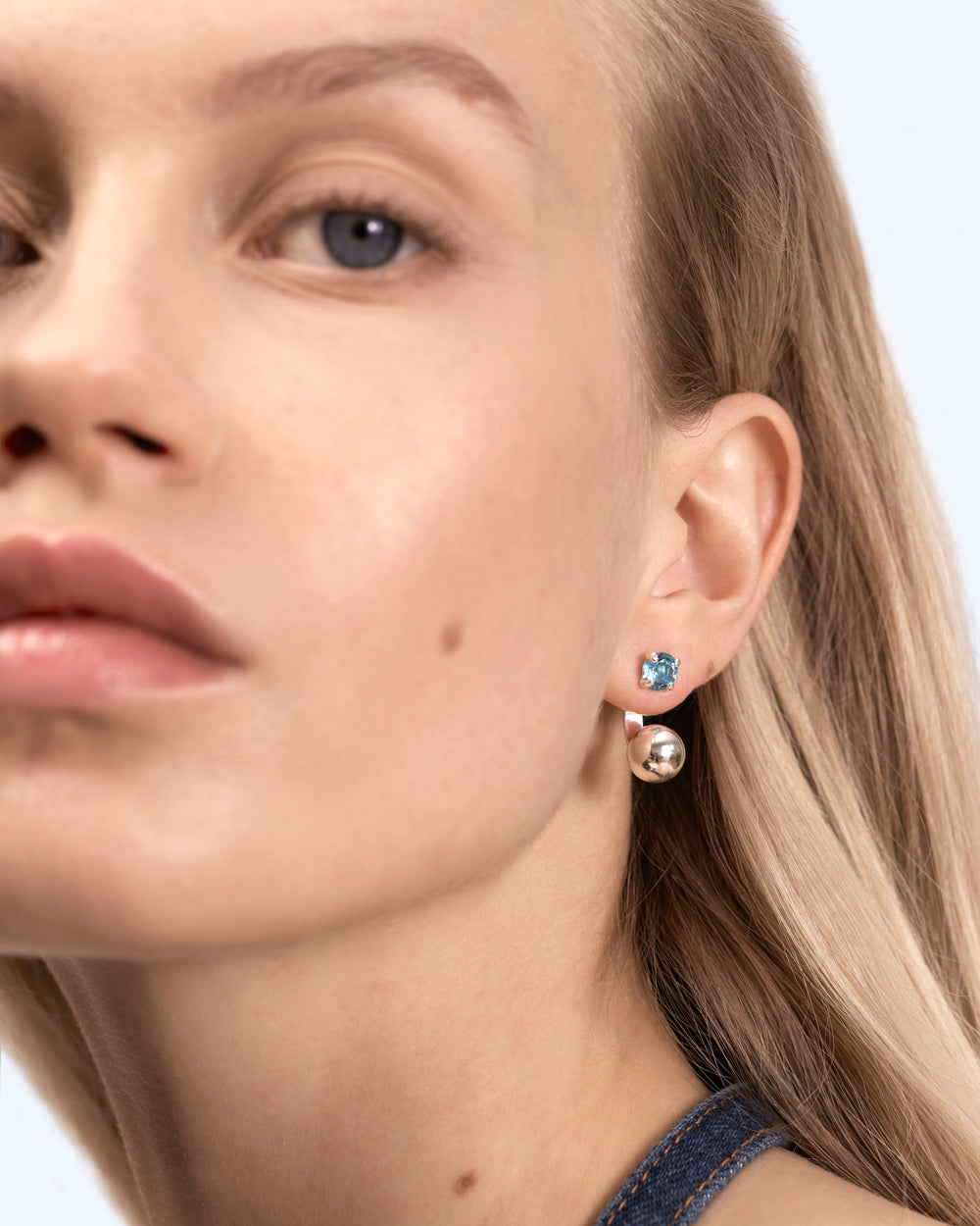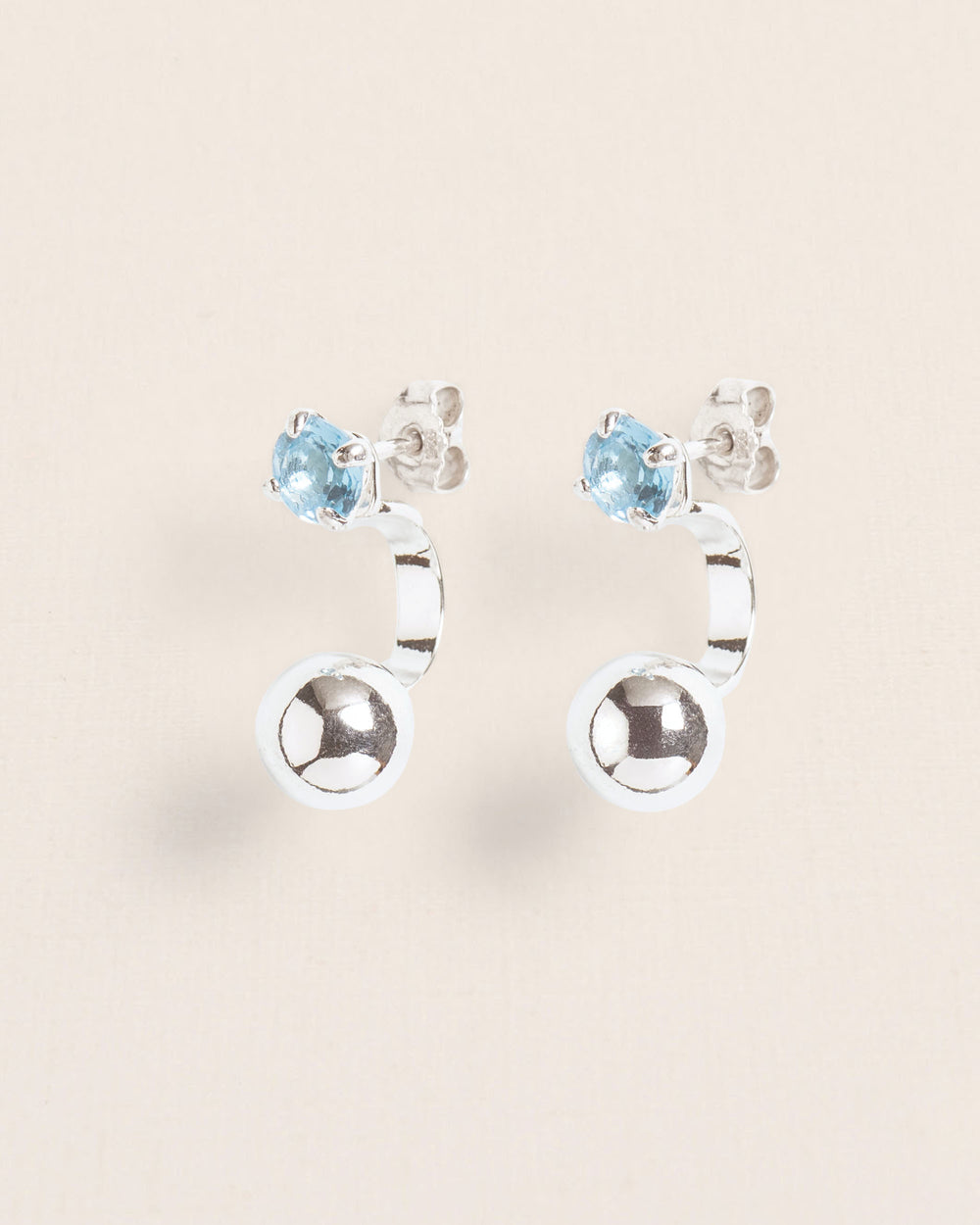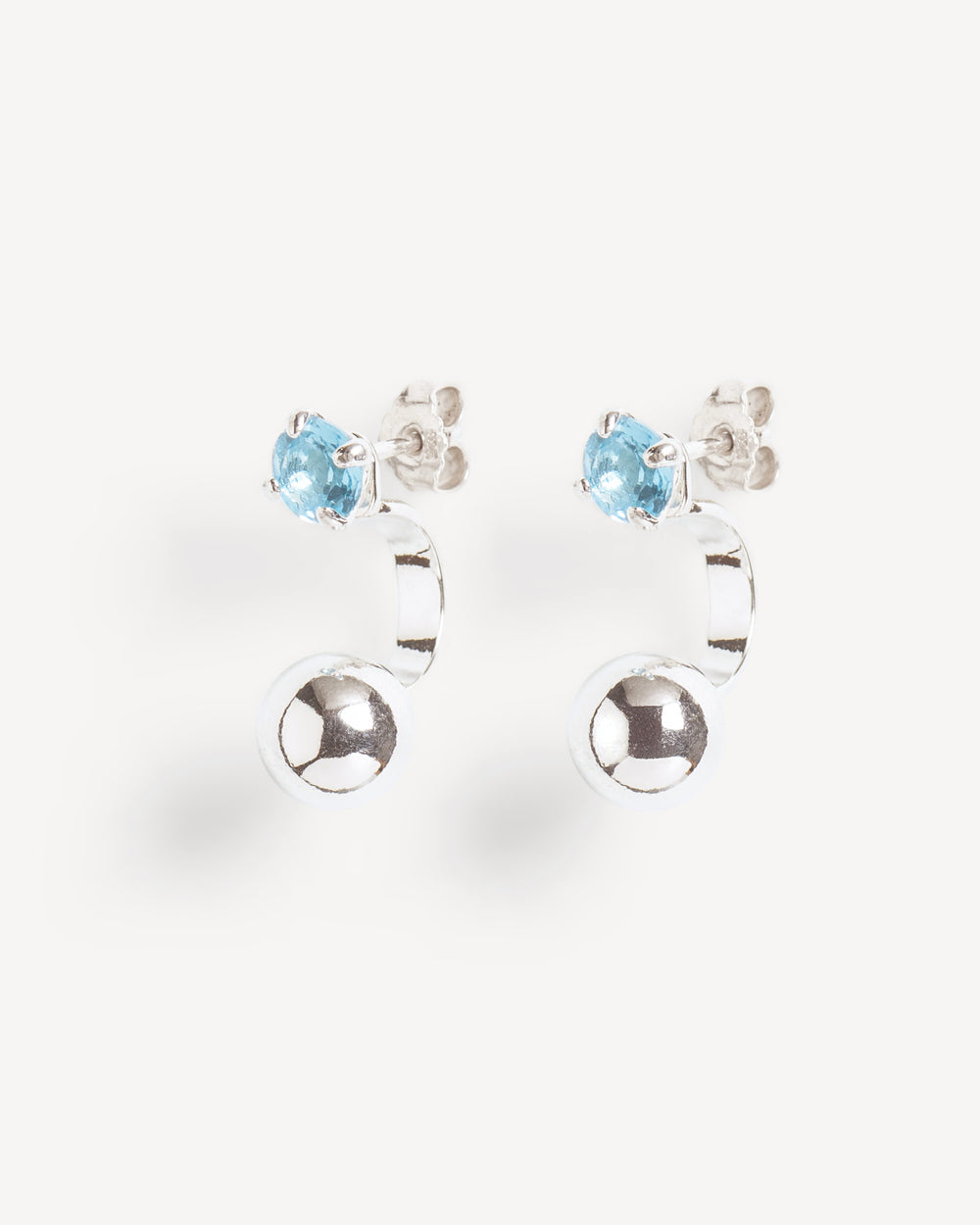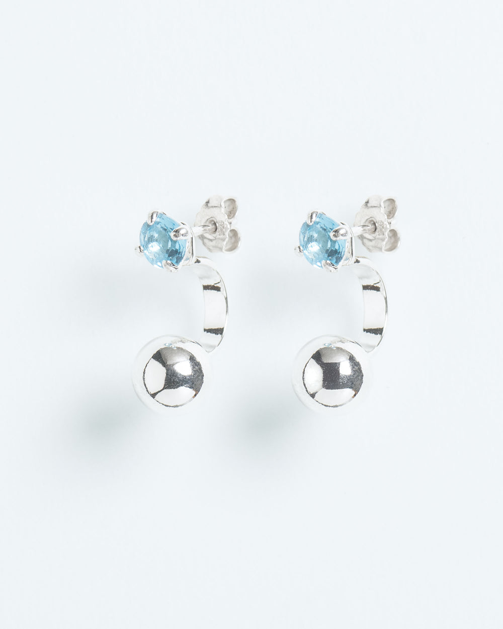 Stud earrings with floating sphere and aquamarine crystal in silver