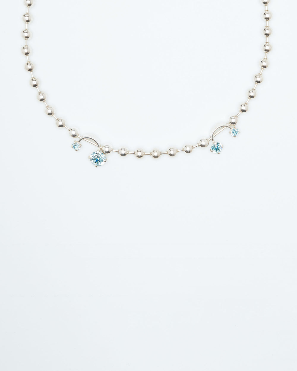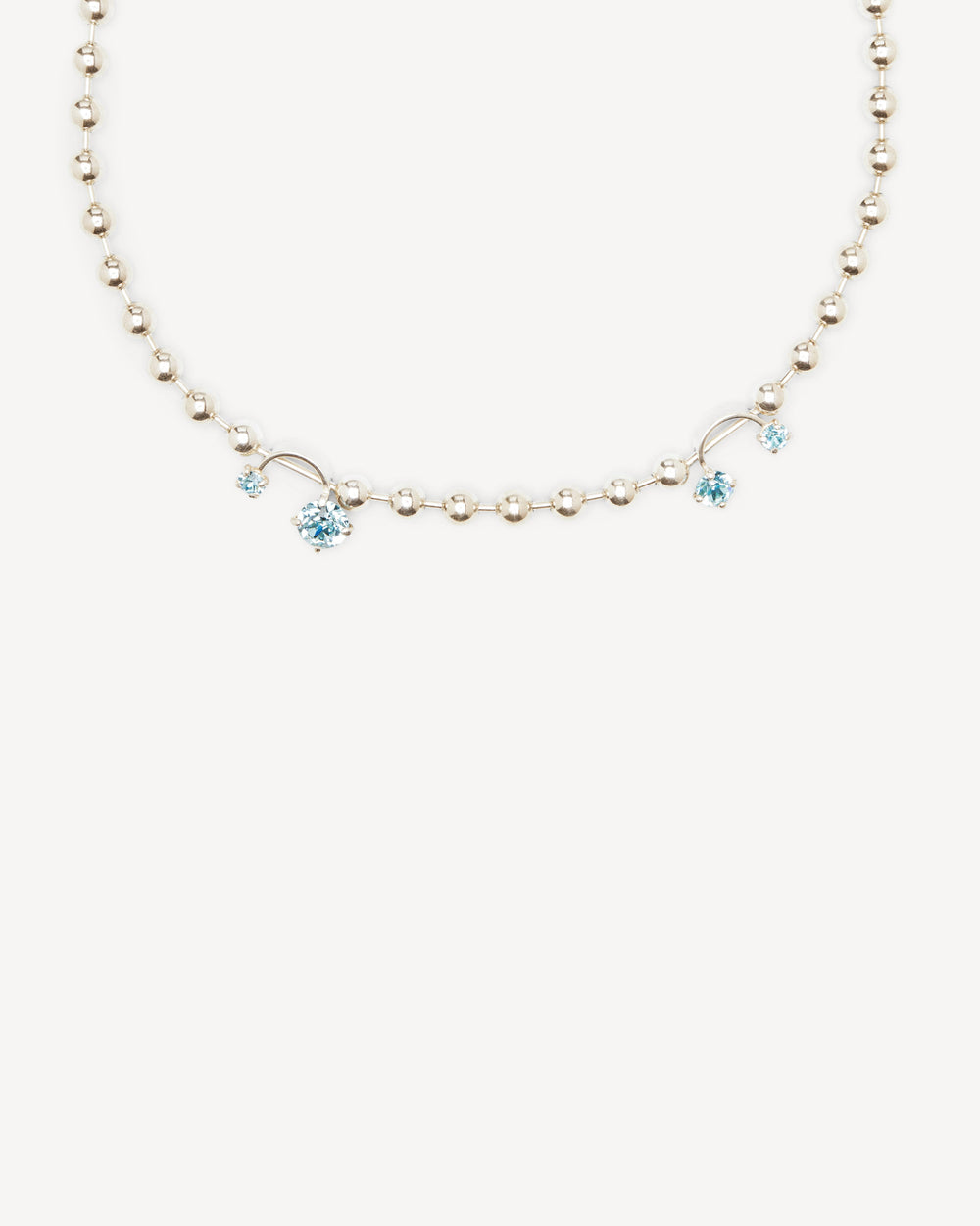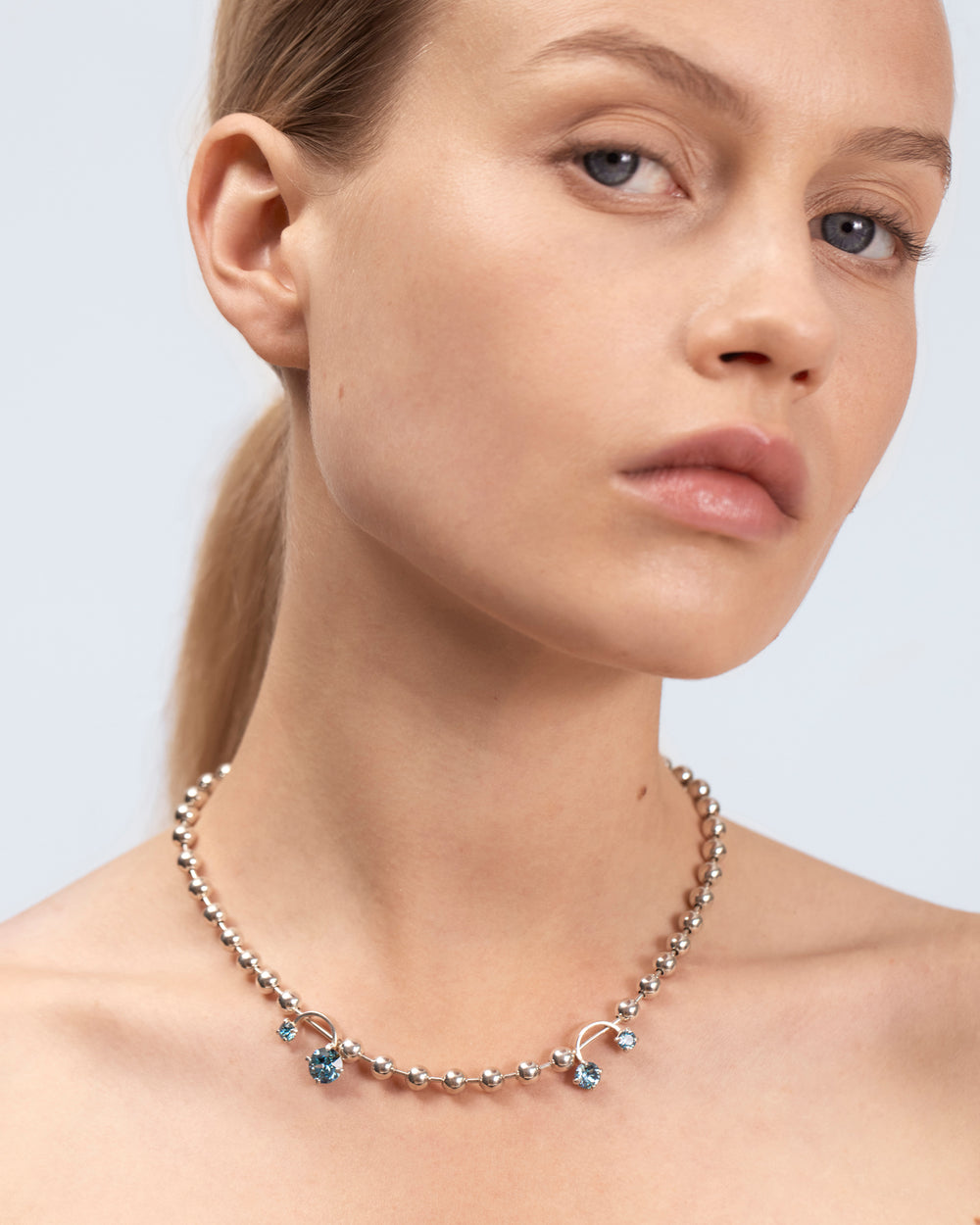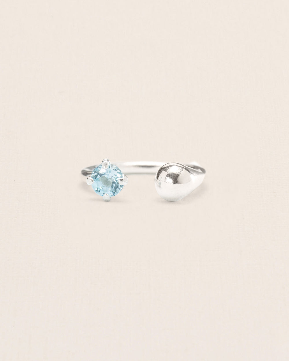 Stud earrings with floating sphere and aquamarine crystal in silver