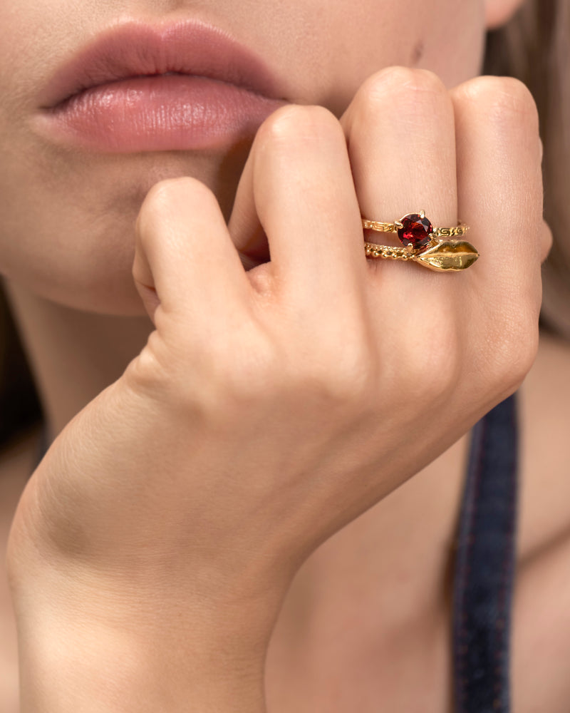 The trompe l'oeil effect makes it seem as if we've stacked two different rings, but this is just an illusion. In fact it is one ring combining a garnet with our signature Wouters & Hendrix lips, a surrealism symbol we are very fond of. Subtle rebels with a love for surrealism, we are drawn to unexpected combinations of materials and techniques, gently adorning your body with tales in silver and gold.