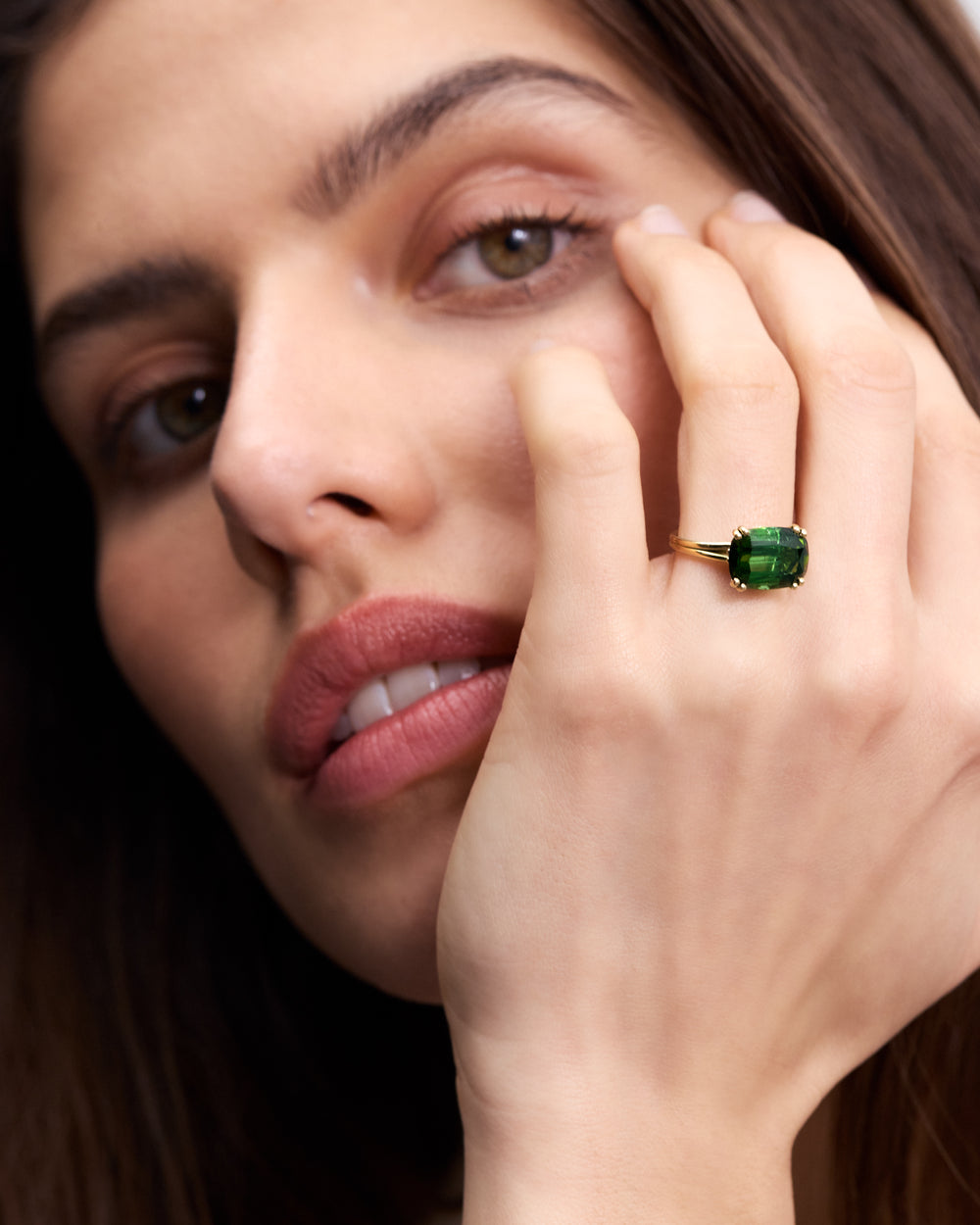 Green tourmaline cocktail ring + set of three stacked organic rings with white diamonds in 18 ct. gold