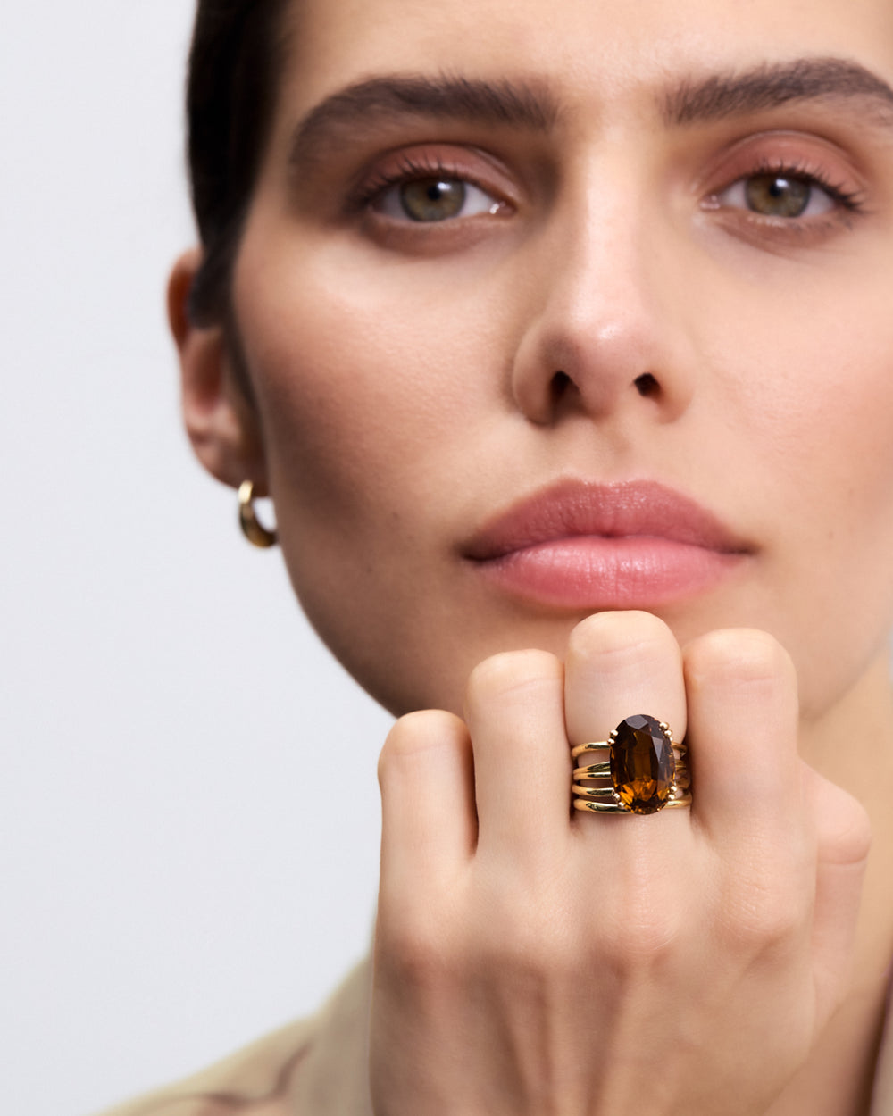 Cognac quartz cocktail ring + set of three stacked organic rings with white diamonds in 18 ct. gold