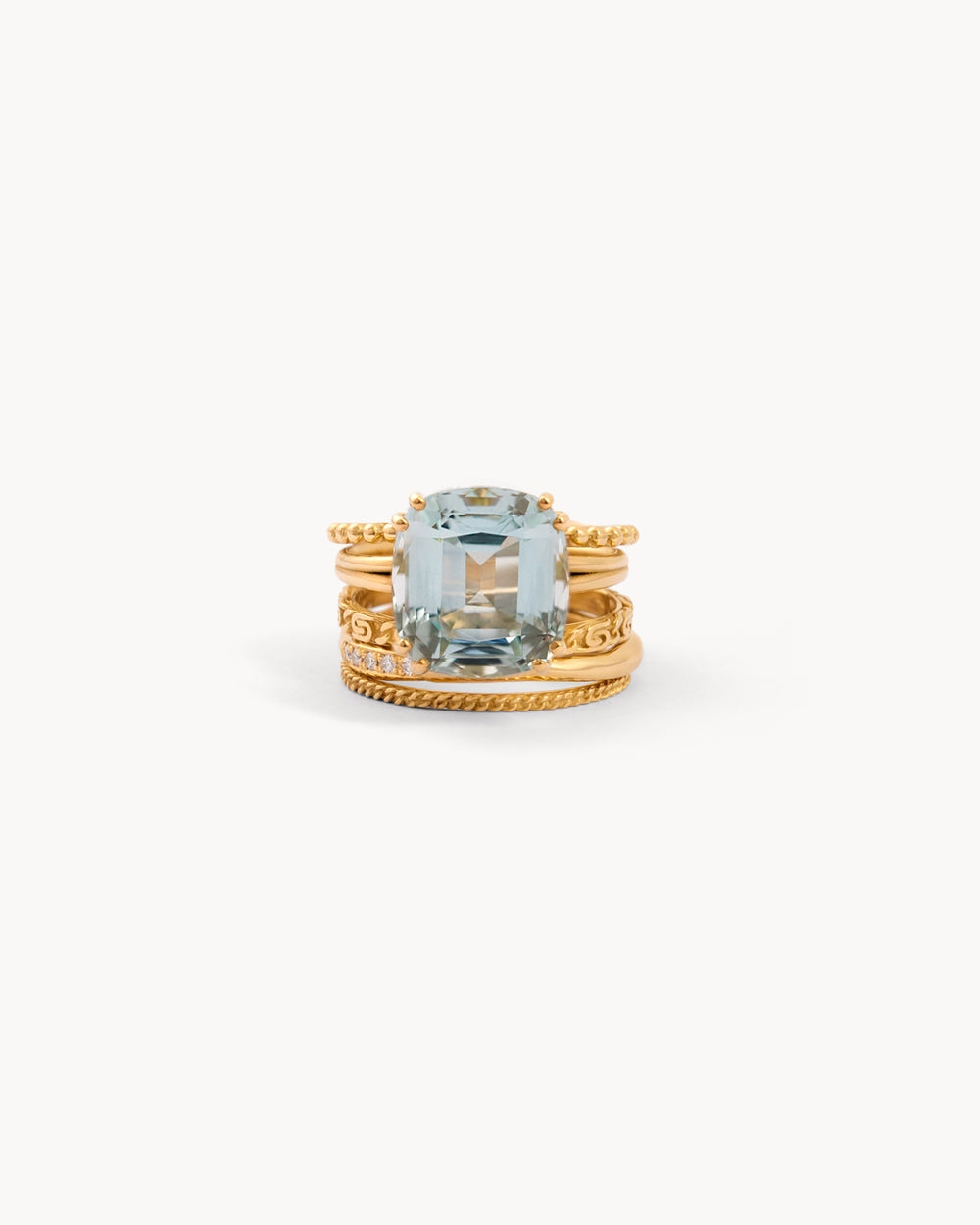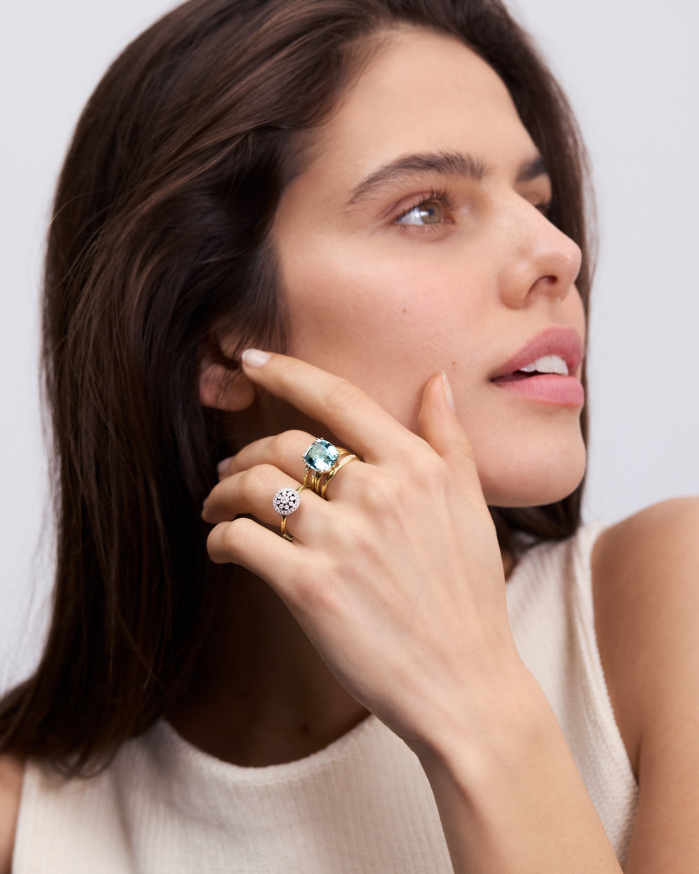 Aquamarine cocktail ring + set of three stacked organic rings with white diamonds in 18 ct. gold