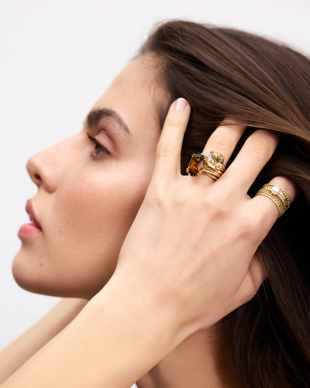 Cognac quartz cocktail ring + Yellow beryl cocktail ring + set of three stacked organic rings with white diamonds in 18 ct. gold