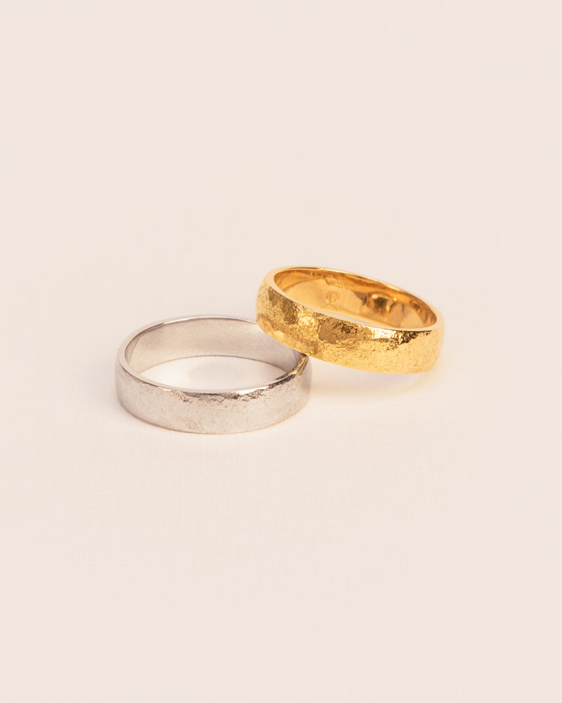 ‘Love Letters’ is a collection of romantic combinations. Classic designs translated into eternity bands, each ring is shaped, polished and engraved by hand. Distinctive in personality, like the sweethearts and suitors of classic literature for which they are named, rings are paired in combinations of opposites attracting. These uncommon wedding bands are meant to become a ‘bijou de peau’, a jewel with which you become one. The Elvis & Priscilla pair is carefully hammered by hand in our Antwerp atelier. This traditional technique is loud, but the result is subtle in its simplicity.