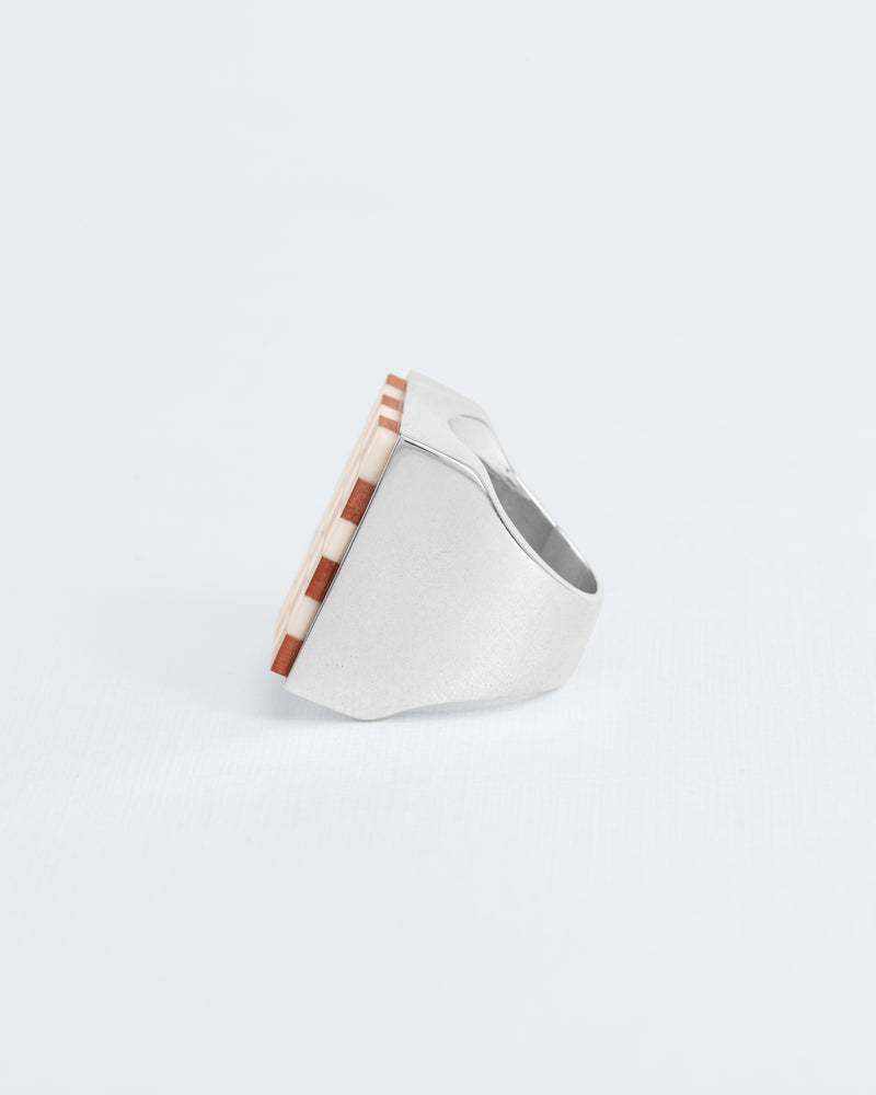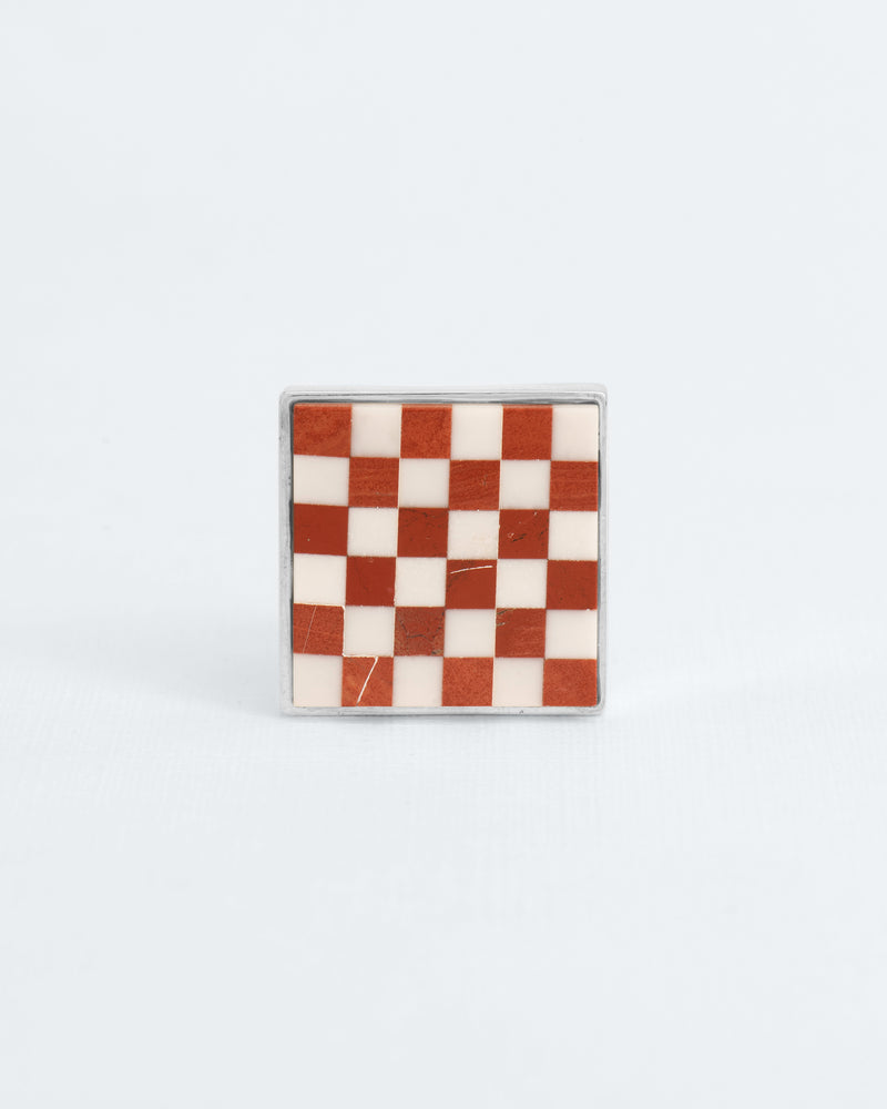 A contemporary interpretation of a signet ring with a statement chess inlay work of red jasper and white onyx. A meticulous work inspired by an old technique often used to decorate cufflinks. Wouters & Hendrix collections have always been full of symbols referencing surrealism. The chessboard in the 'La Fête des Bêtes' collection is a reference to Man Ray and Marcel Duchamp.