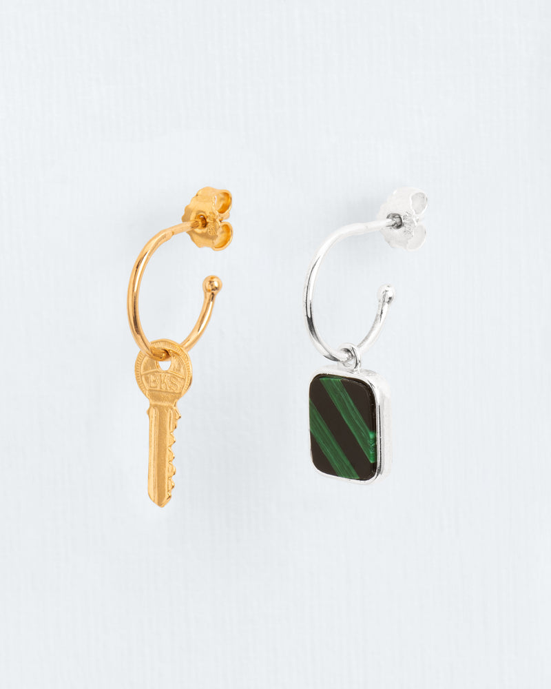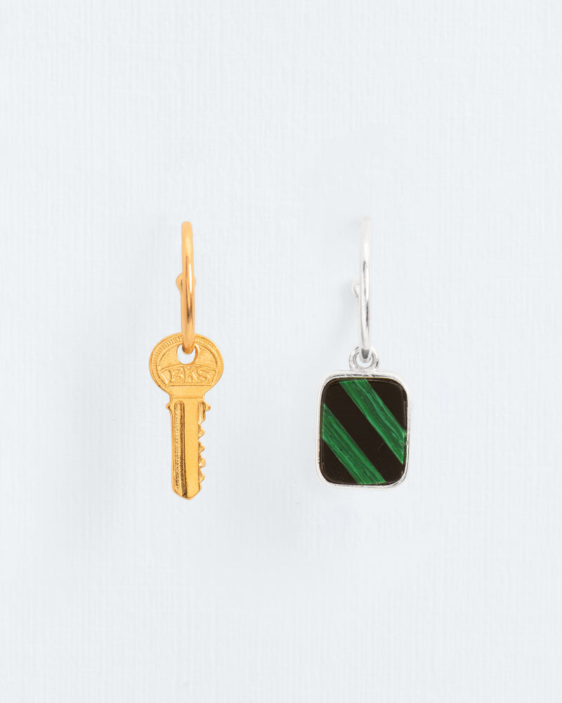 Asymmetric hoop earrings with key and malachite and onyx mosaic pendants