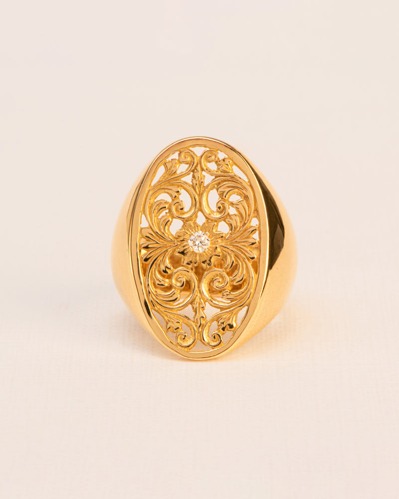 In the 'La Belle Héritière' collection, Wouters & Hendrix explores archetypes of heirloom pieces. Reminiscent of antique jewellery motifs, this ring combines filigree with a subtle diamond for an unexpected take on tradition. Exuding unique artistry, every Wouters & Hendrix piece is handmade by a team of goldsmiths in our Antwerp atelier.