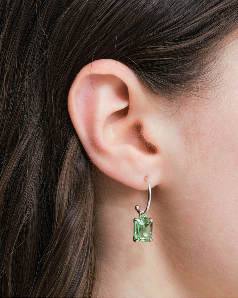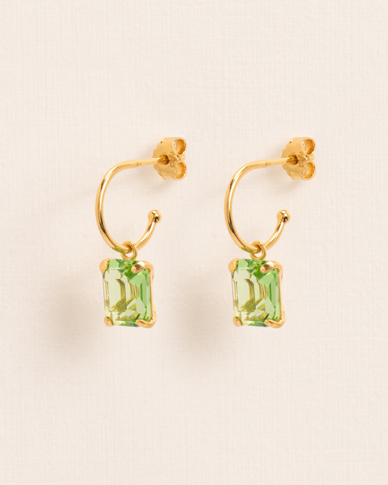 Hoop earrings with peridot crystal from the 'Les Eternelles' collection. Associated with vitality and renewal, the peridot crystal radiates a bright, verdant energy, symbolizing strength and growth, that is uninterrupted by our handmade settings. Lost in colours, this collection consists of icontournables that become a part of you, treasures to have and to hold forever.