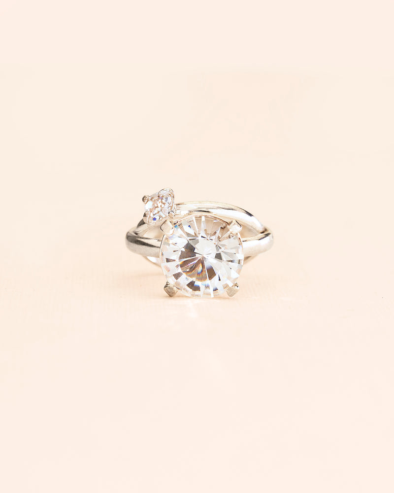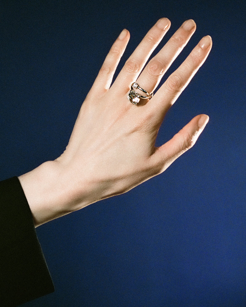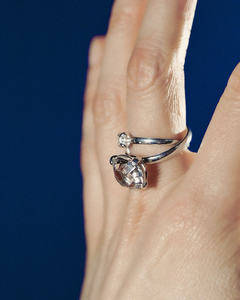 In the design of this ring from the 'Midnight Children' collection, two intertwined classical solitaire rings act as precious jewellery components and bright crystals, nodding to nocturnal flashes of light, take centre stage. The silver finish steals the show, echoing black and white scenes after dark. ‘Midnight Children’ is the epitome of what punk exemplifies in the world of Wouters & Hendrix. Inspired by the poetry of nightlife, the collection blurs the boundaries between chunky and delicate, between fancy and ferocious, making it a companion on your every adventure from day to night. Exuding a unique artistry, every Wouters & Hendrix piece is handmade by a team of goldsmiths in our Antwerp atelier.