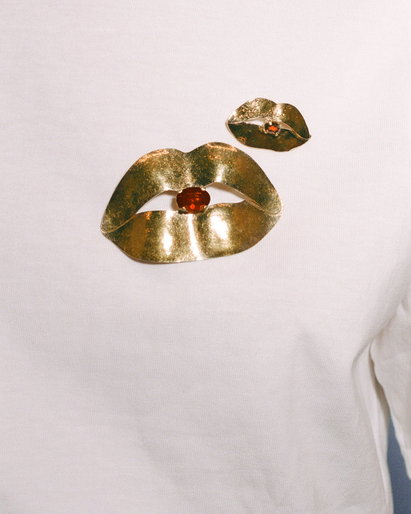 The Wouters & Hendrix lips referencing Dali's surrealist Mae West Lips Sofa and carefully holding a garnet are a Wouters & Hendrix eyecatcher. Having lived through many collections, this brooch is as timeless as it is peculiar. Subtle rebels with a love for surrealism, we are drawn to unexpected combinations of materials and techniques, gently adorning your body with tales in silver and gold.