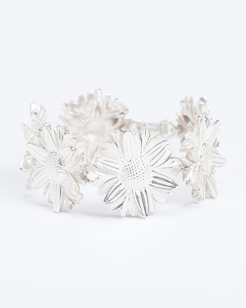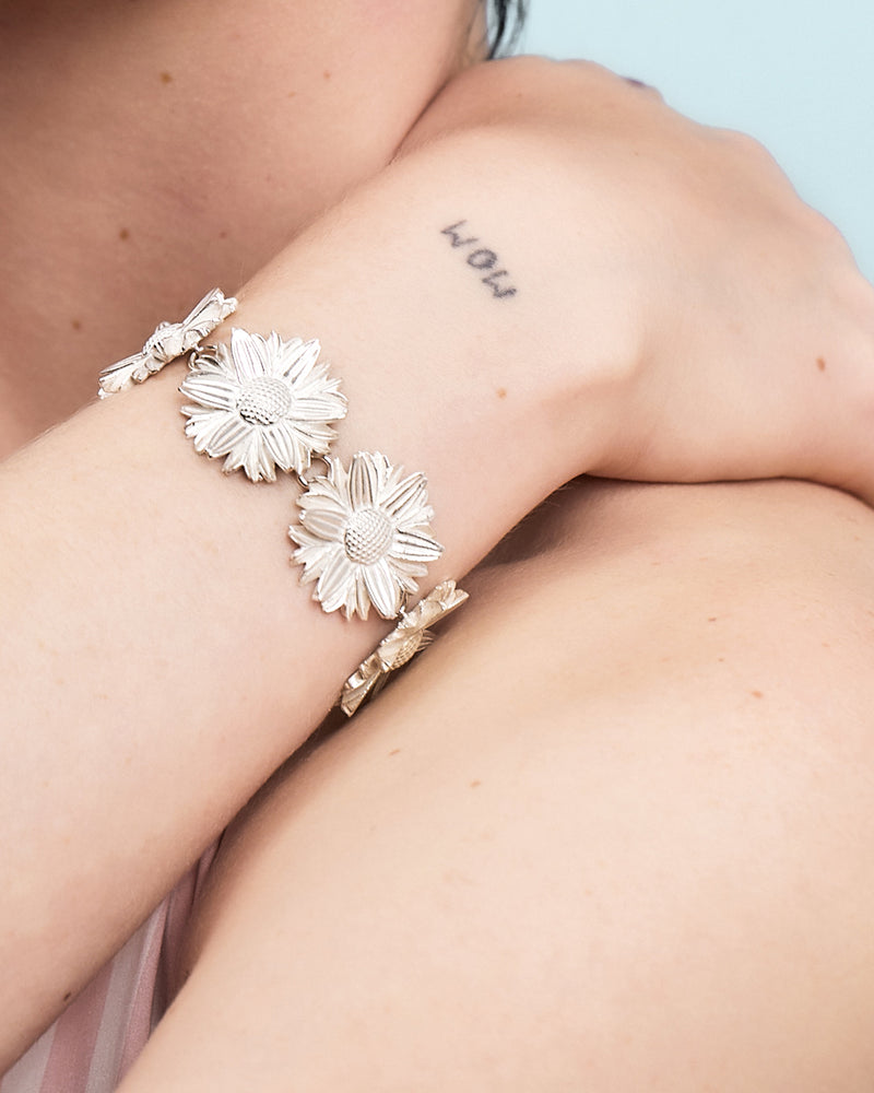 Time passes irrevocably but our silver and golden daisies are everlasting – this statement daisy bracelet is a frisky and fluttering antidote to the present.