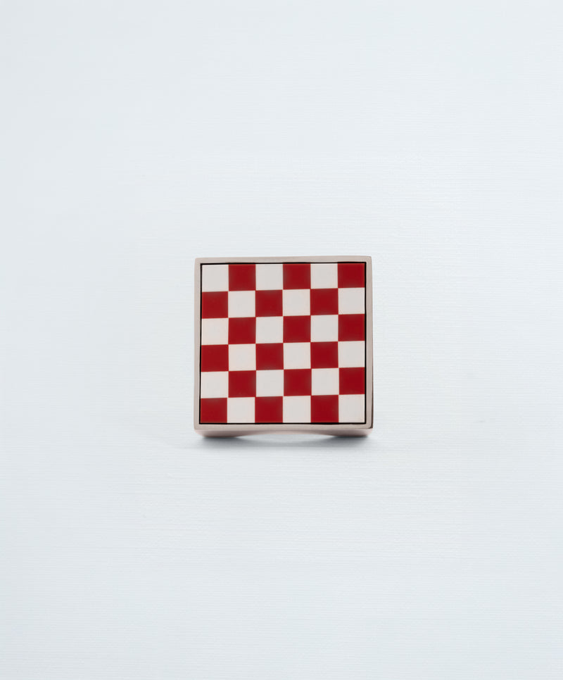 A contemporary interpretation of a signet ring with a statement chess inlay work of red jasper and white onyx. A meticulous work inspired by an old technique often used to decorate cufflinks. Wouters & Hendrix collections have always been full of symbols referencing surrealism. The chessboard in the 'La Fête des Bêtes' collection is a reference to Man Ray and Marcel Duchamp.