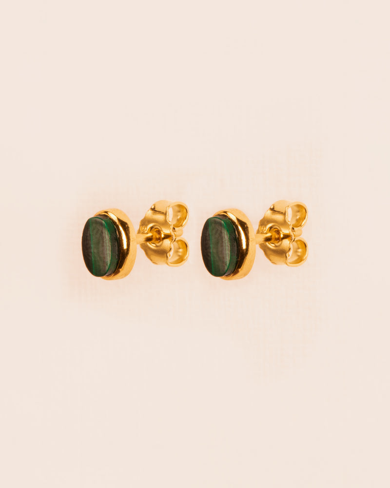 These stud earrings with smooth malachite are part of the 'Les Eternelles' collection. The minimalist setting allows the malachite to radiate. An ancient beauty that has already dorned palaces. Exposing the intrinsic beauty of the material, 'Les Eternelles' reaches back to essential forms from the beginning of time.