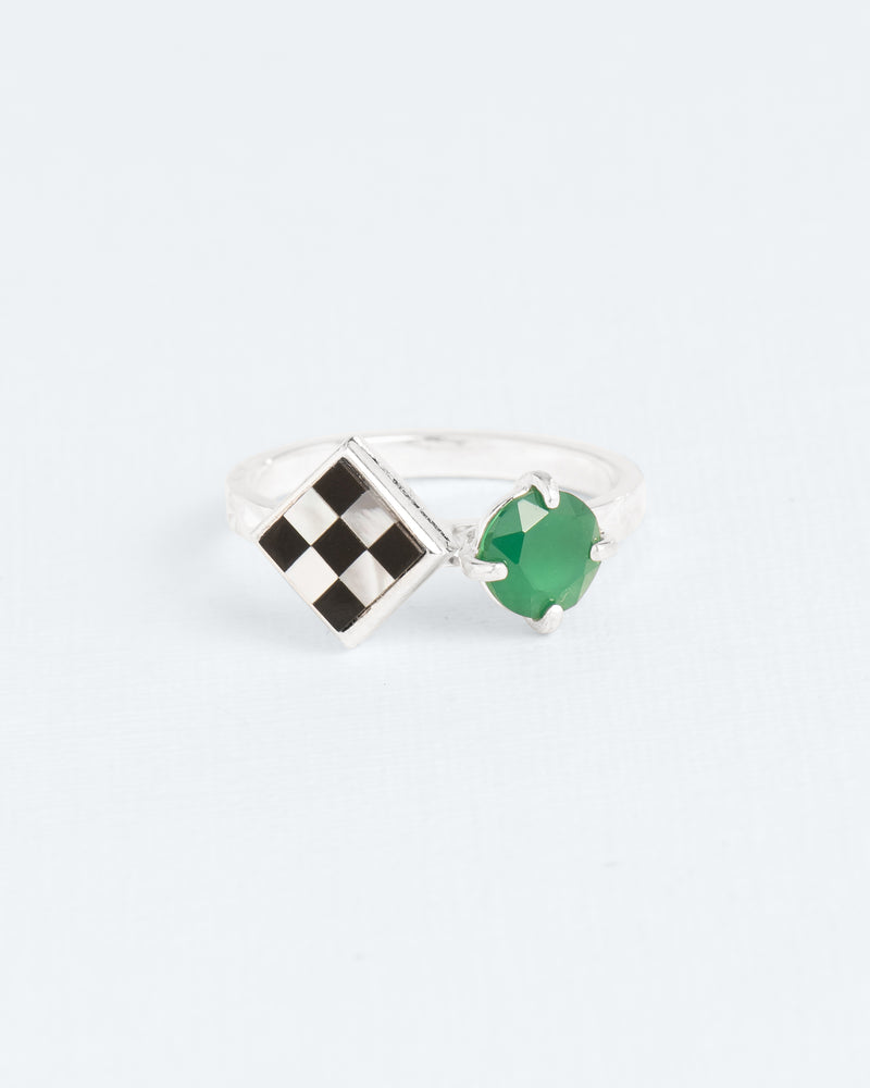 Textured ring with onyx and mother of pearl mosaic and green agate
